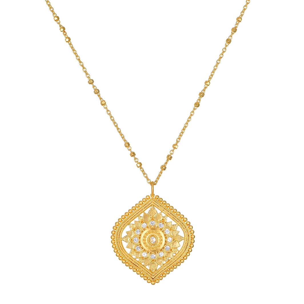 Awaken Awareness Lotus White Topaz Necklace - With openness and curiosity, we awaken awareness of the beauty and hope that surrounds us. An eye-catching lotus petal medallion necklace in 18kt gold plate is accented with brilliant white topaz stones, a celebration of individuality, creativity, and awareness. Wear this eye-catching medallion as a meaningful personal talisman.