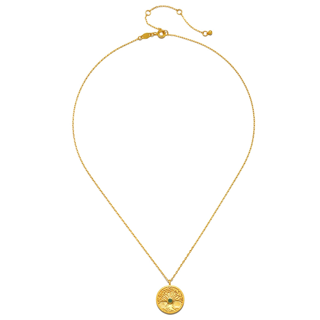 Abundant Grounding Tree Necklace An 18kt gold plated pendant necklace is graced with the tree of life, symbol of deep faith and grounding. At its center, a brilliant emerald—stone of wisdom, abundance, and mercy—shines. On the back, a delicate inscription reads the mantra: I Am Grounded.