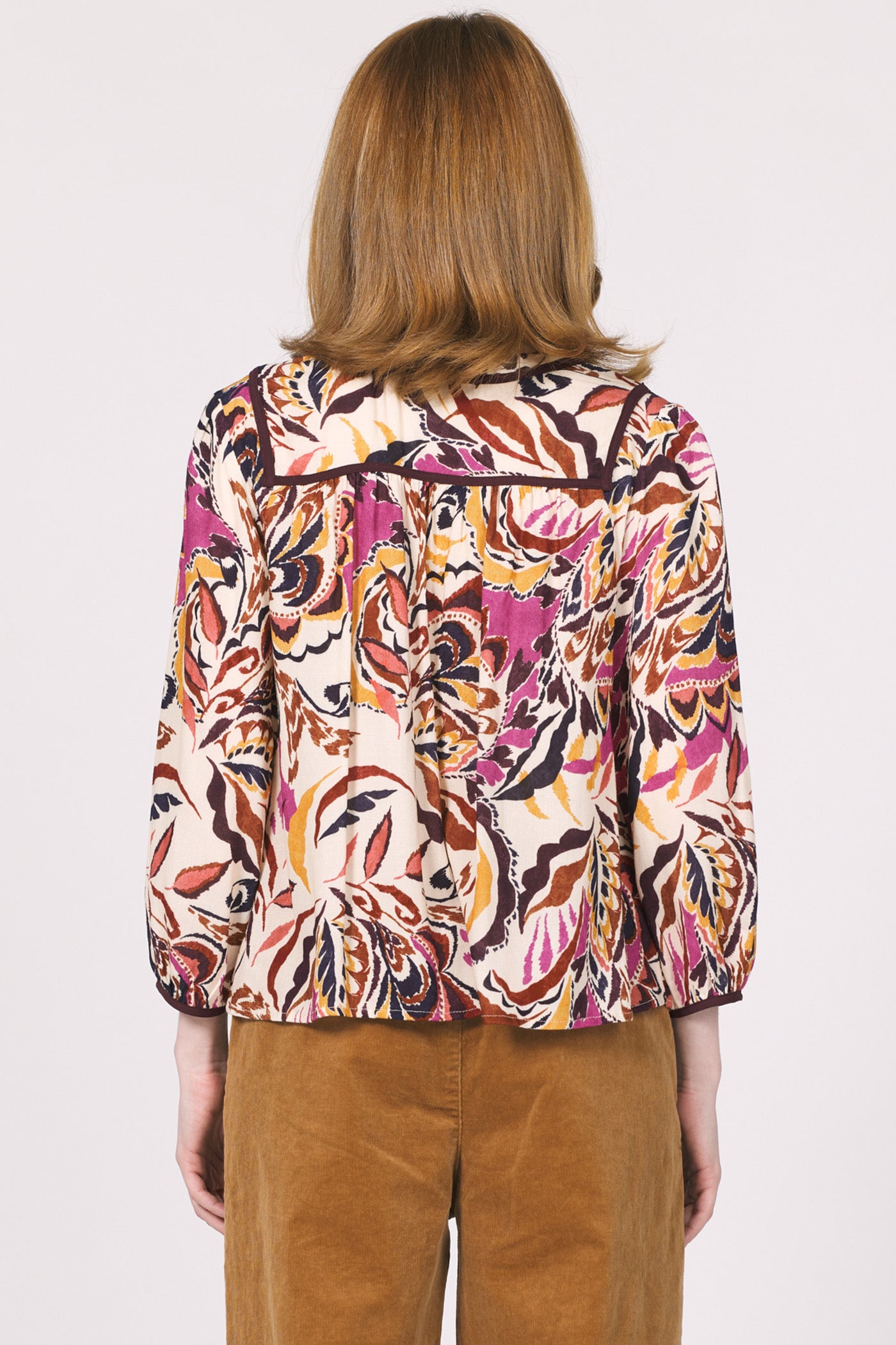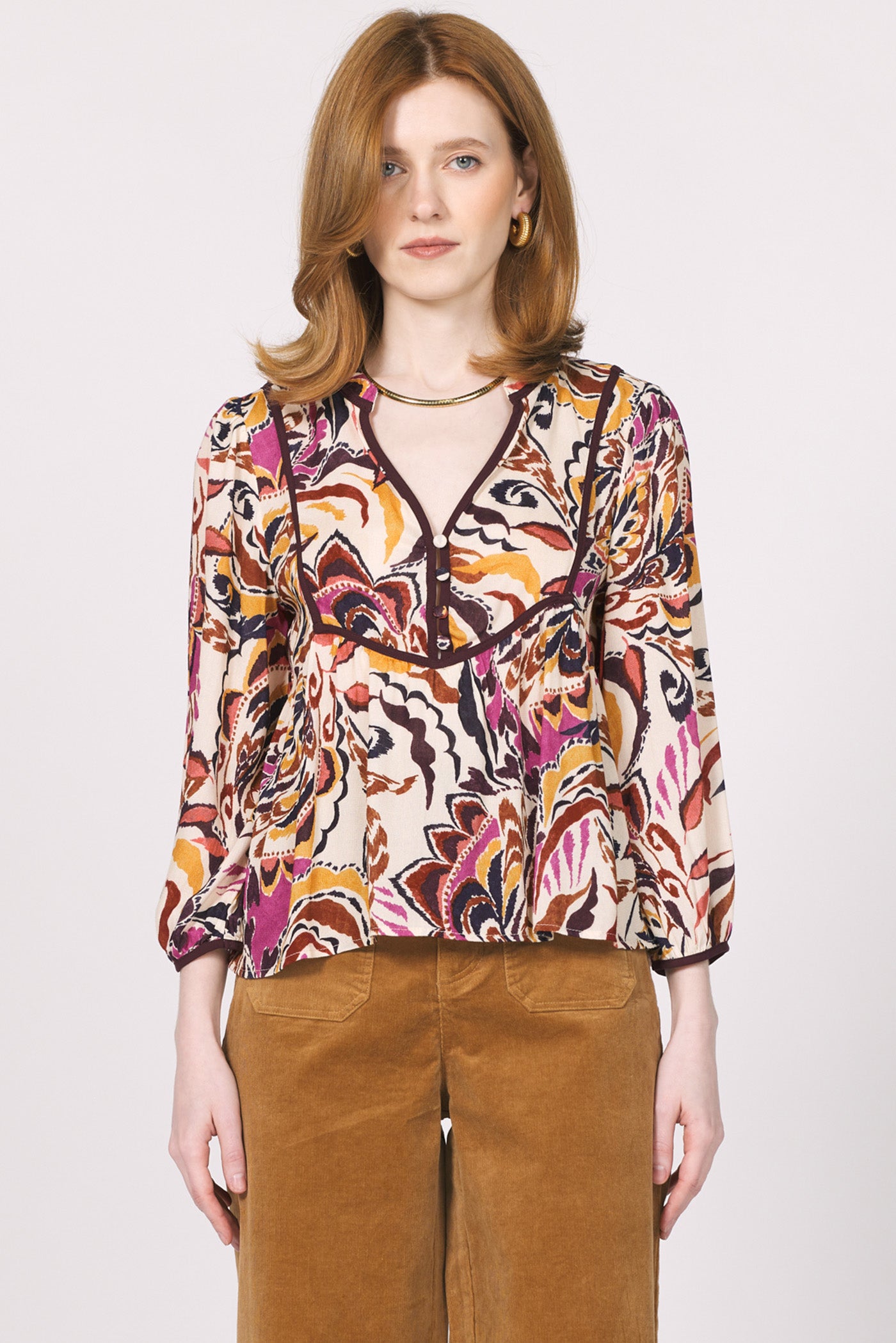 This top features three-quarter length sleeves with distinctive contrast detailing for a refined, professional look.