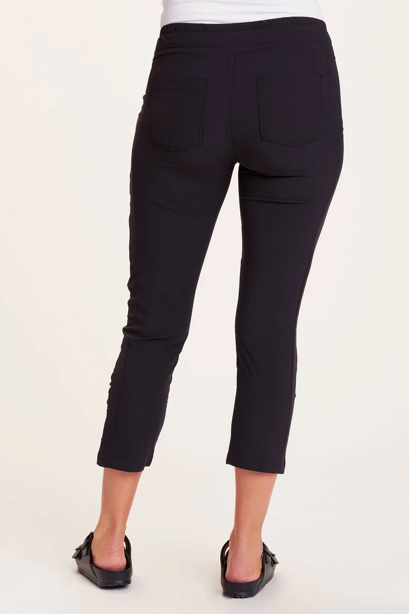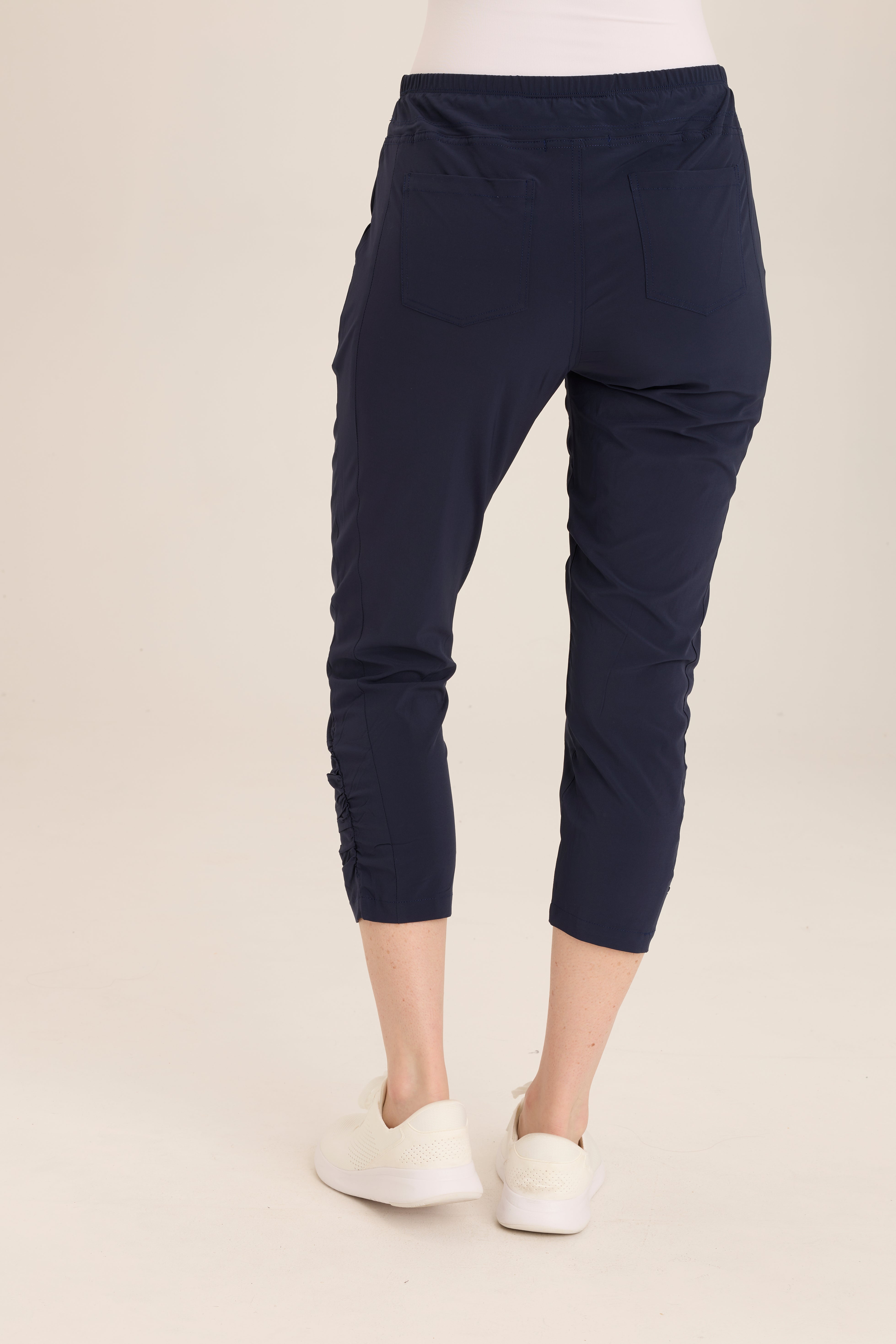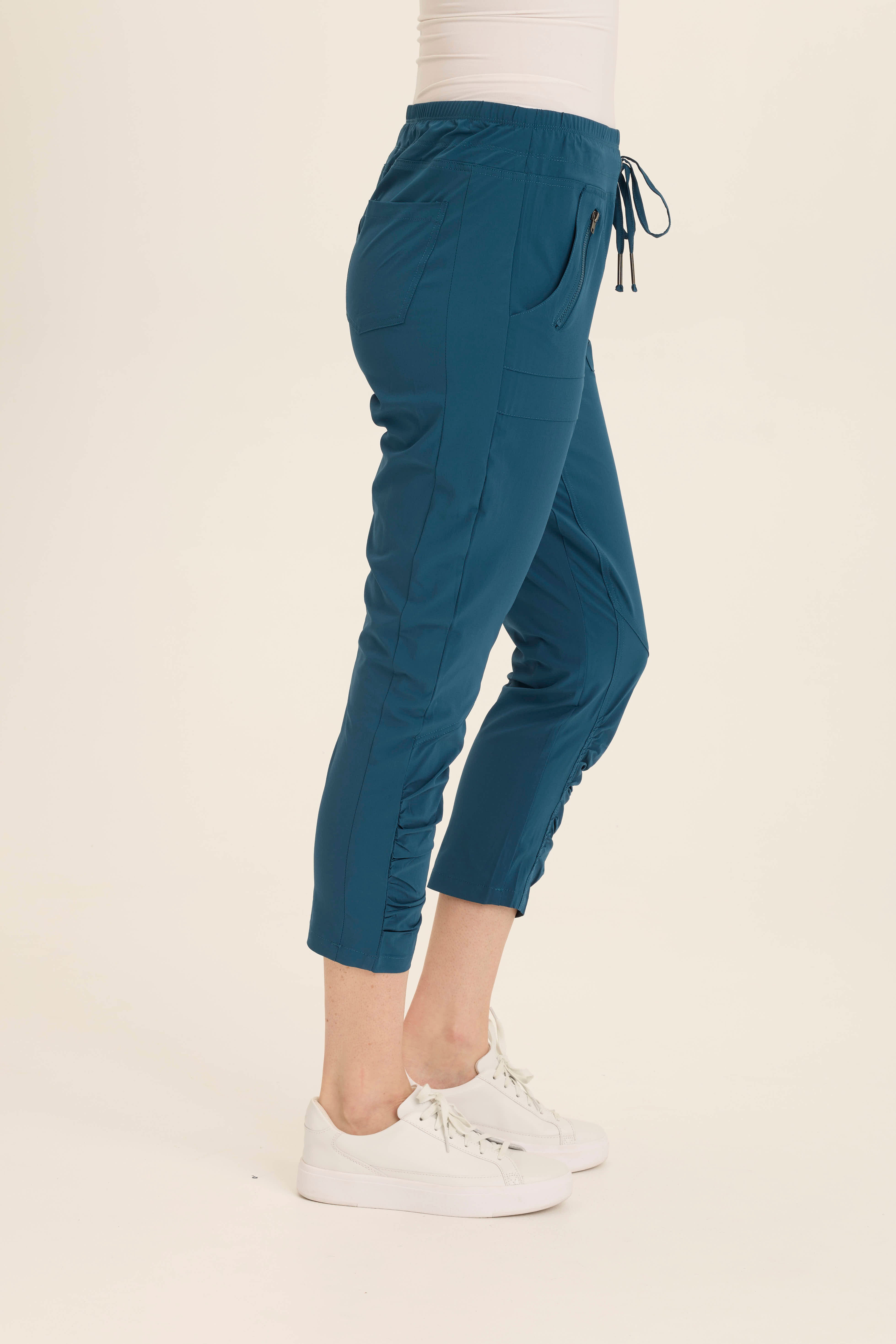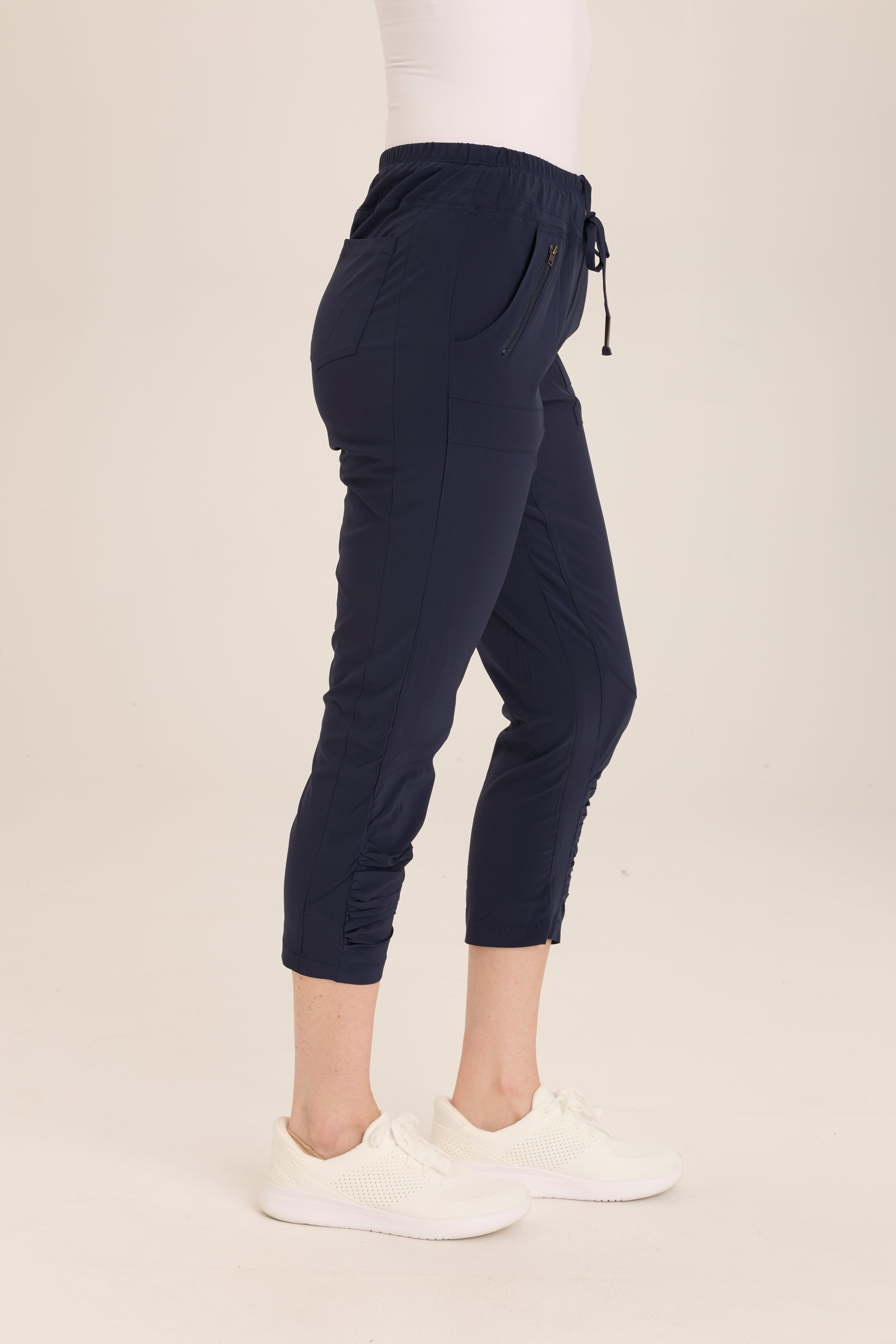 This active legging features a drawstring waist, front pockets with zipper details, our classic ruched leg panels, back pockets and enough sass to keep you going all day!