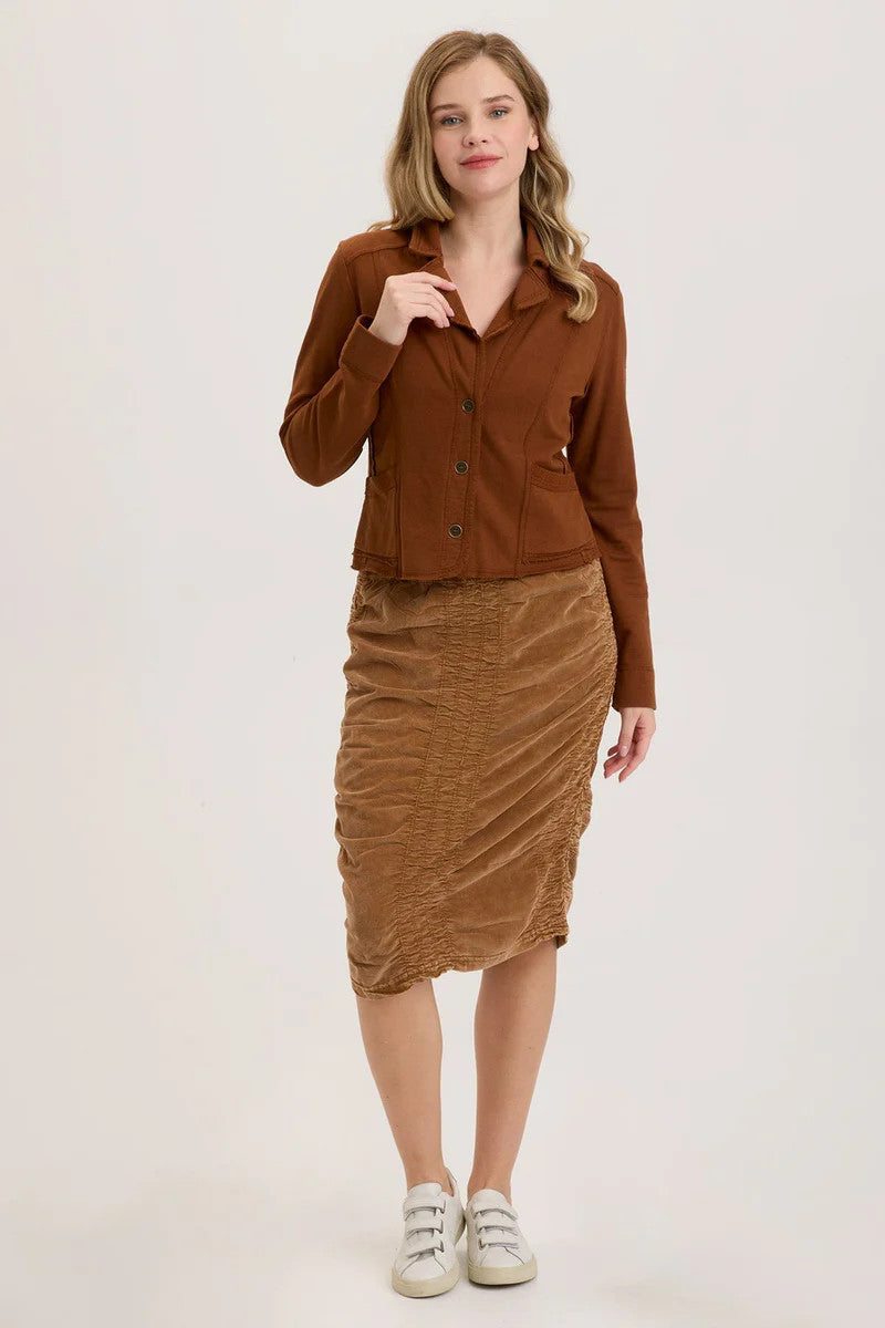 Our most flattering skirt got a little make over. The Trace Midi has been update with a high waist pull on jersey waistband and ruching from waistline to knee length hem.