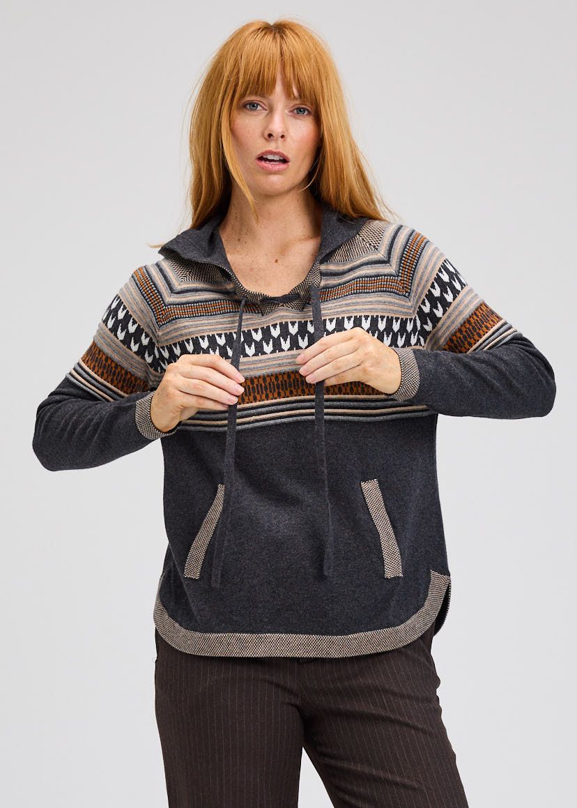 The Apres sweater hoodie offers a delightful blend of charm and sophistication, featuring detailed patterns around the collar for a refined look.