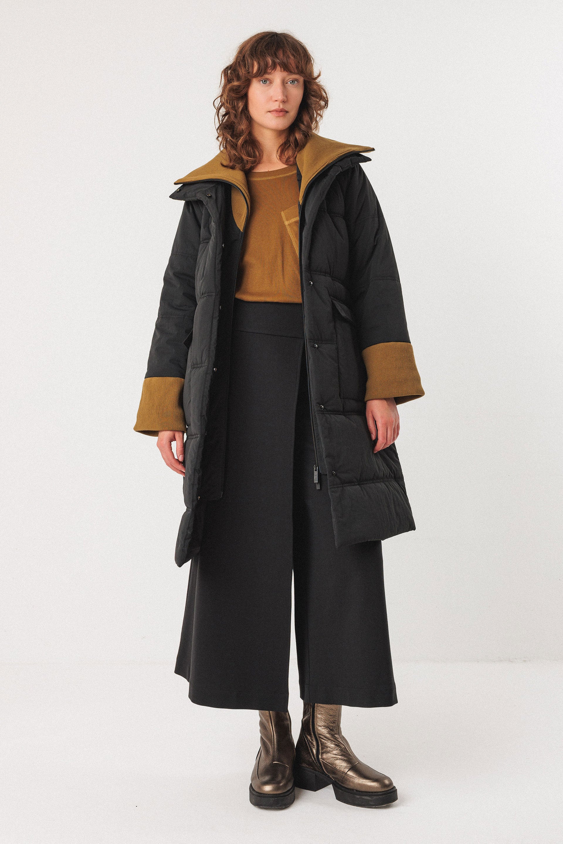 Draped, ankle-high culottes with wide legs and side pockets. They zip at the front and the draped section is held in place by two rectangular buckles.