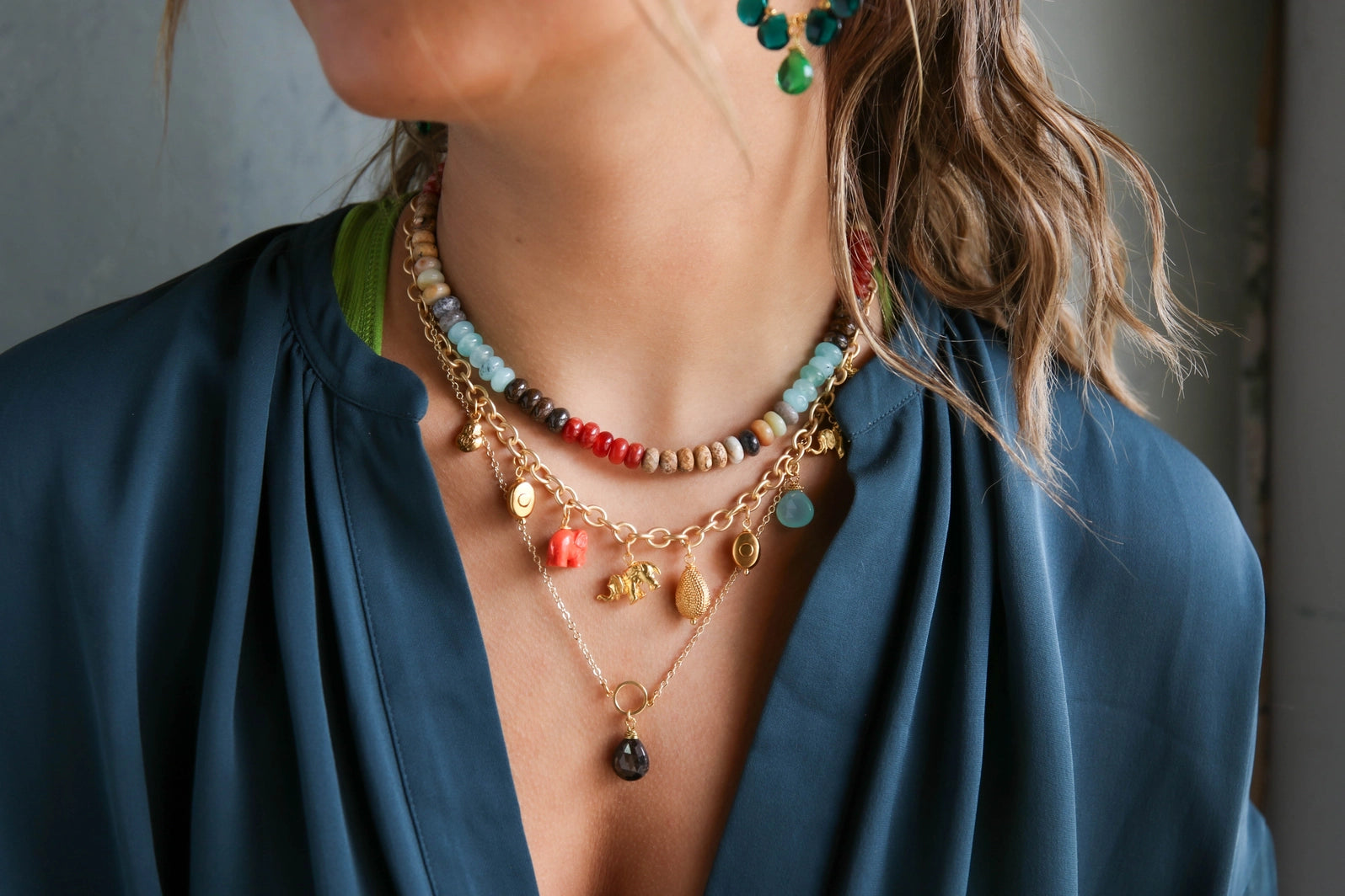 The Beading Dreams Necklace in Peruvian Opal or in Sunstone is for the woman who views her jewelry as an essential part of her expression. She likes to have lots of jewelry in her wardrobe, to layer with purpose, and knows how to use color!