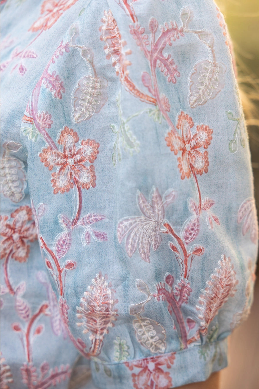 Softly textured embroidered top in faded blue featuring delicate floral stitching in coral and white, with covered buttons, and puff sleeves. V-neck with button down front. Fully lined.