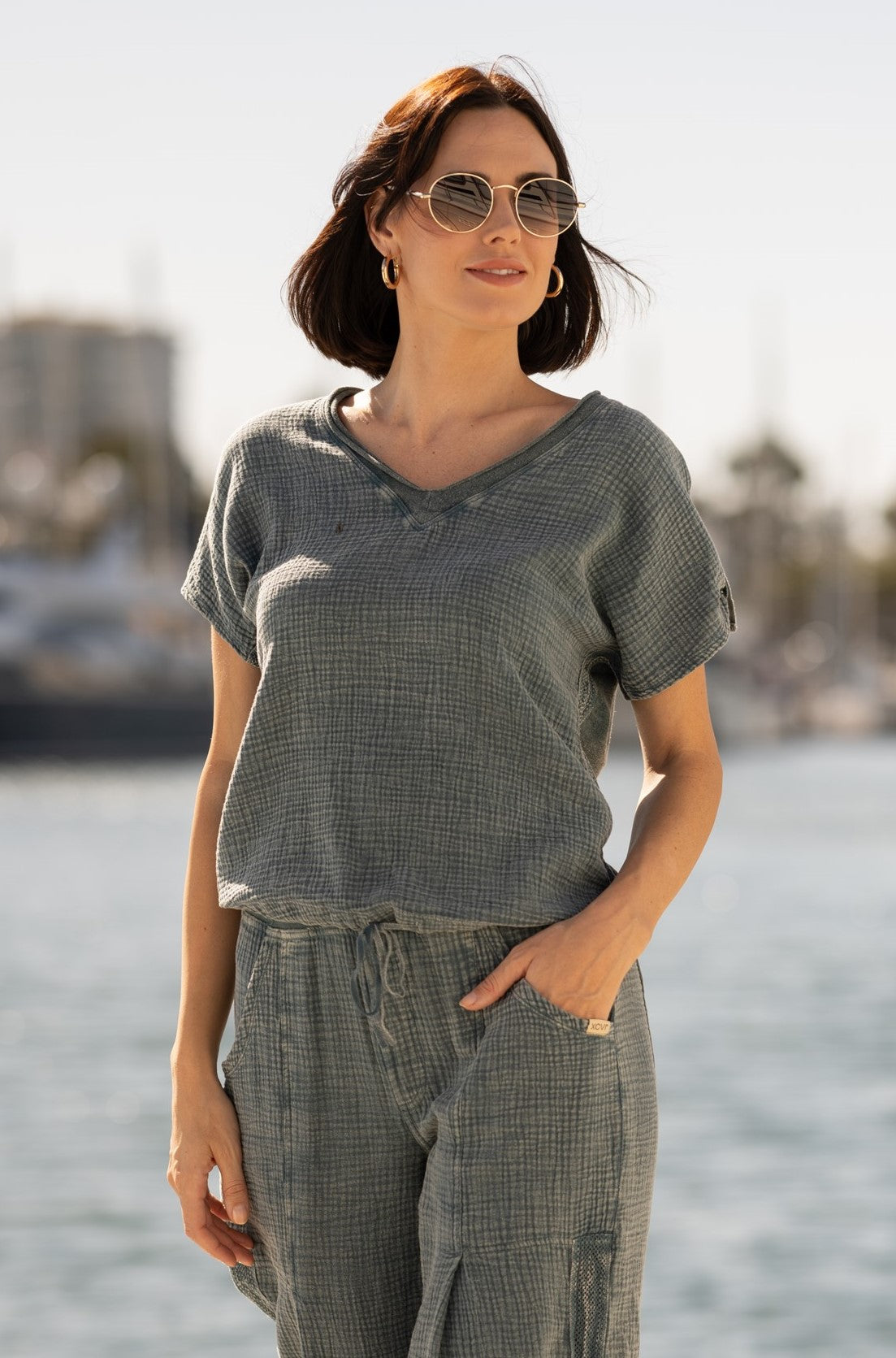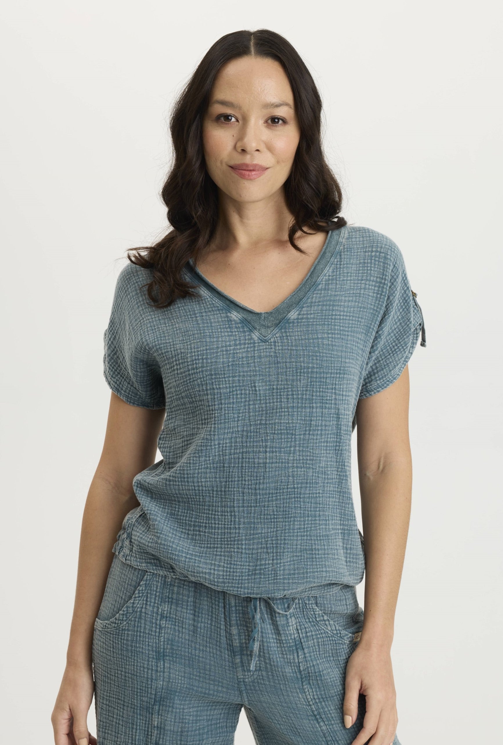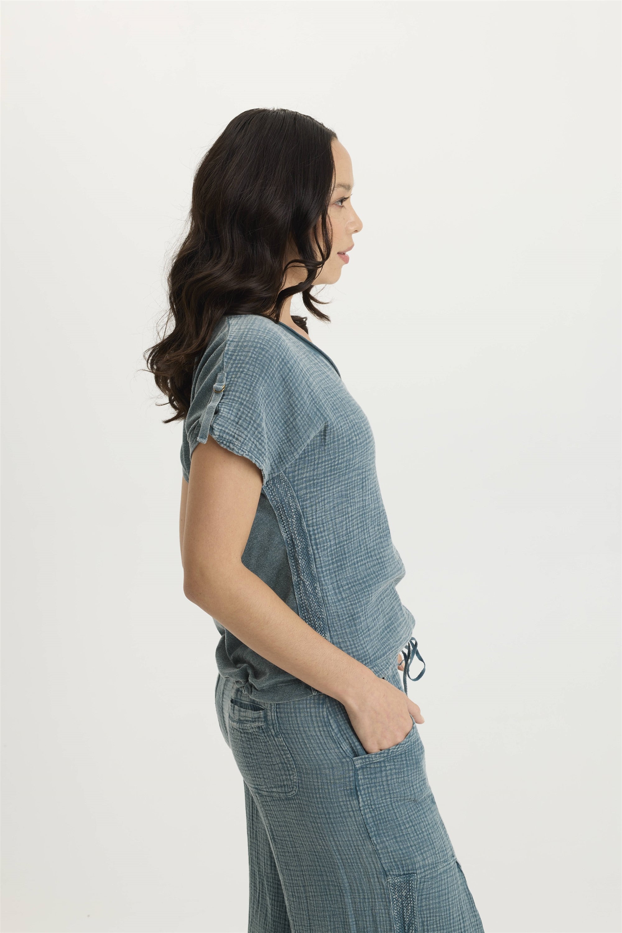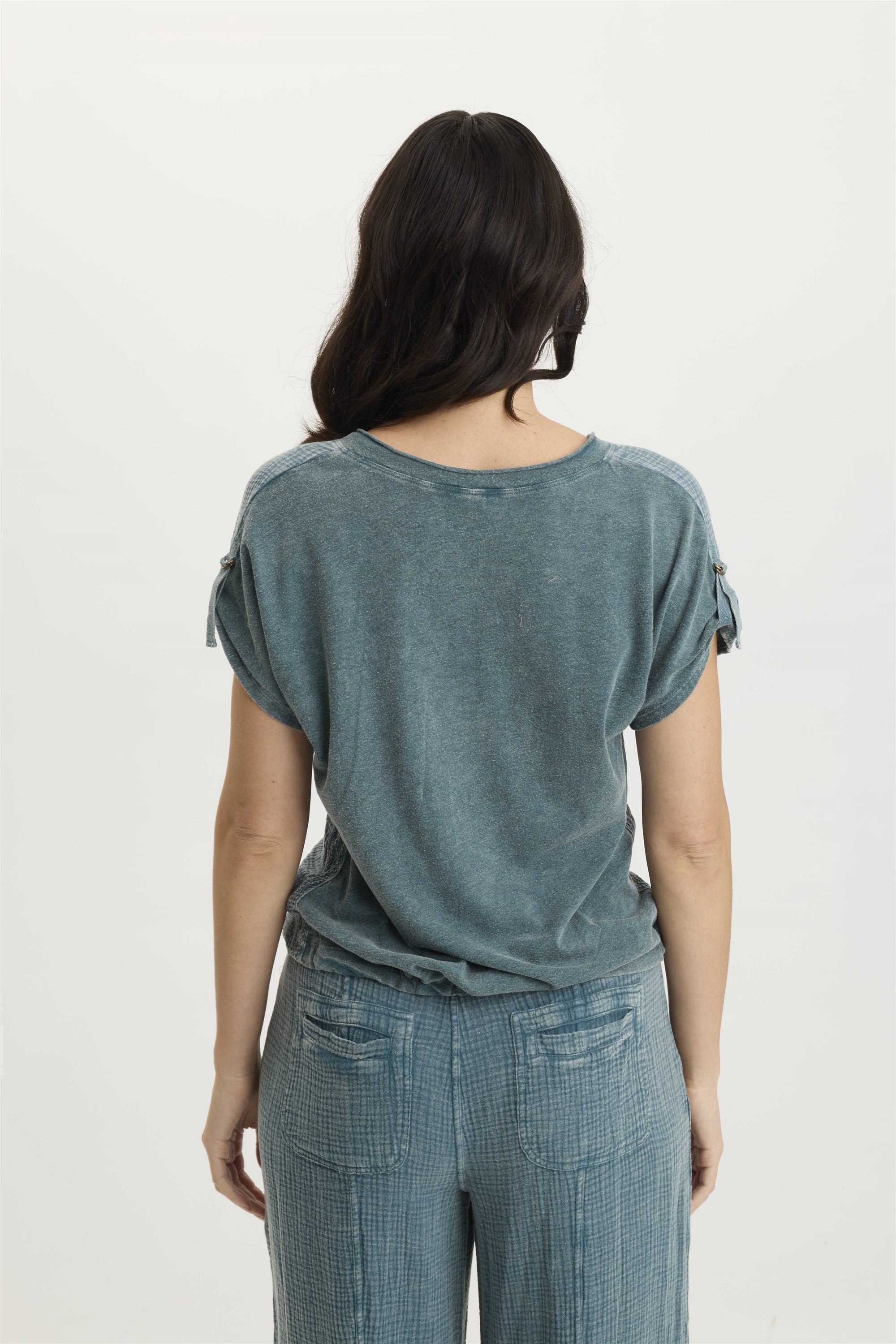 In a traditional XCVI silhouette, Bower V-Neck Tee has tabbed short sleeves, mesh trim inserts, a cinchable bubble hem and a contrasting slub jersey back panel.