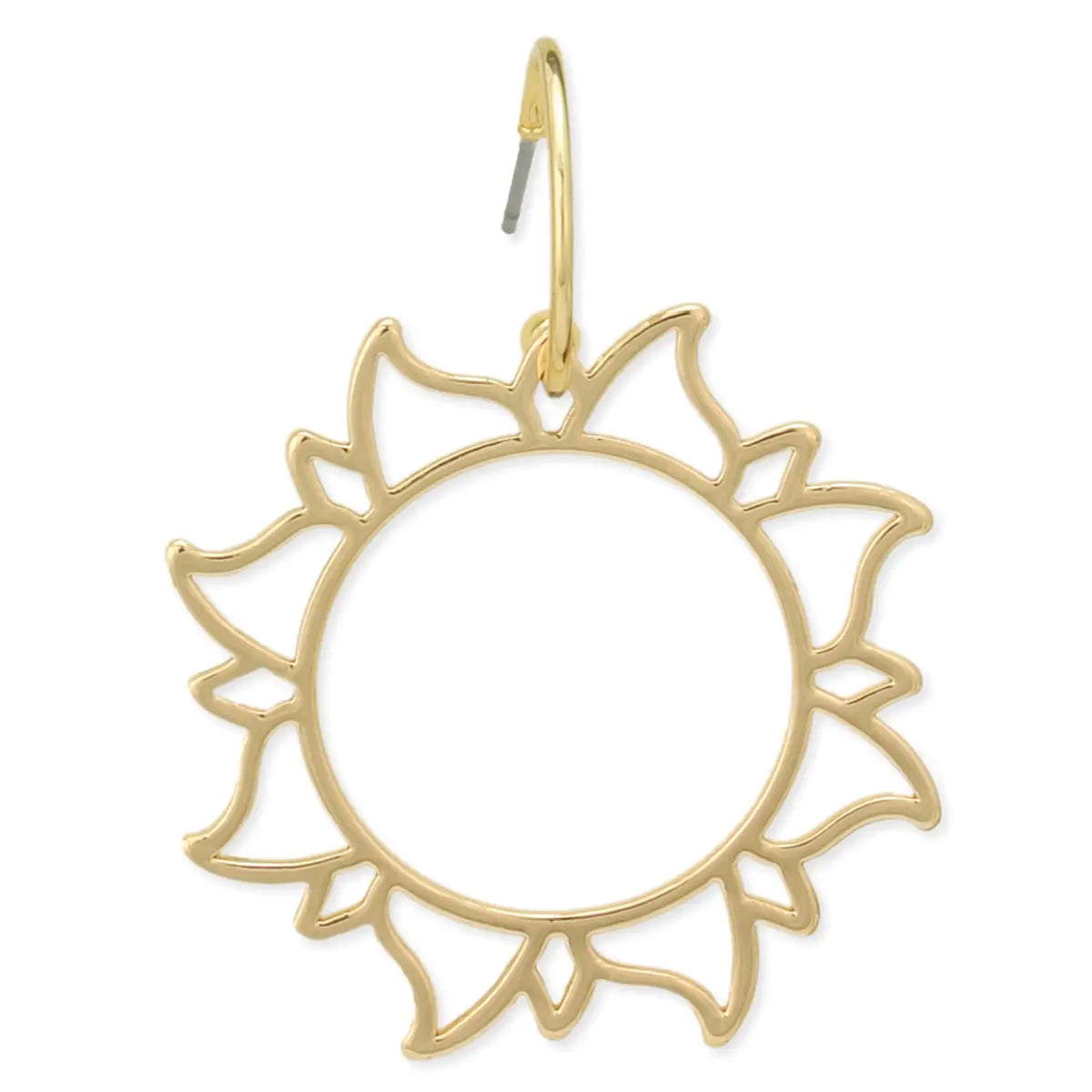 Look on the bright side, wearing these adorable sunshine hoop earrings. A delicate gold hoop features a large sun outline charm. Wear these sunny little earrings to add an extra ray of sunshine to your look.