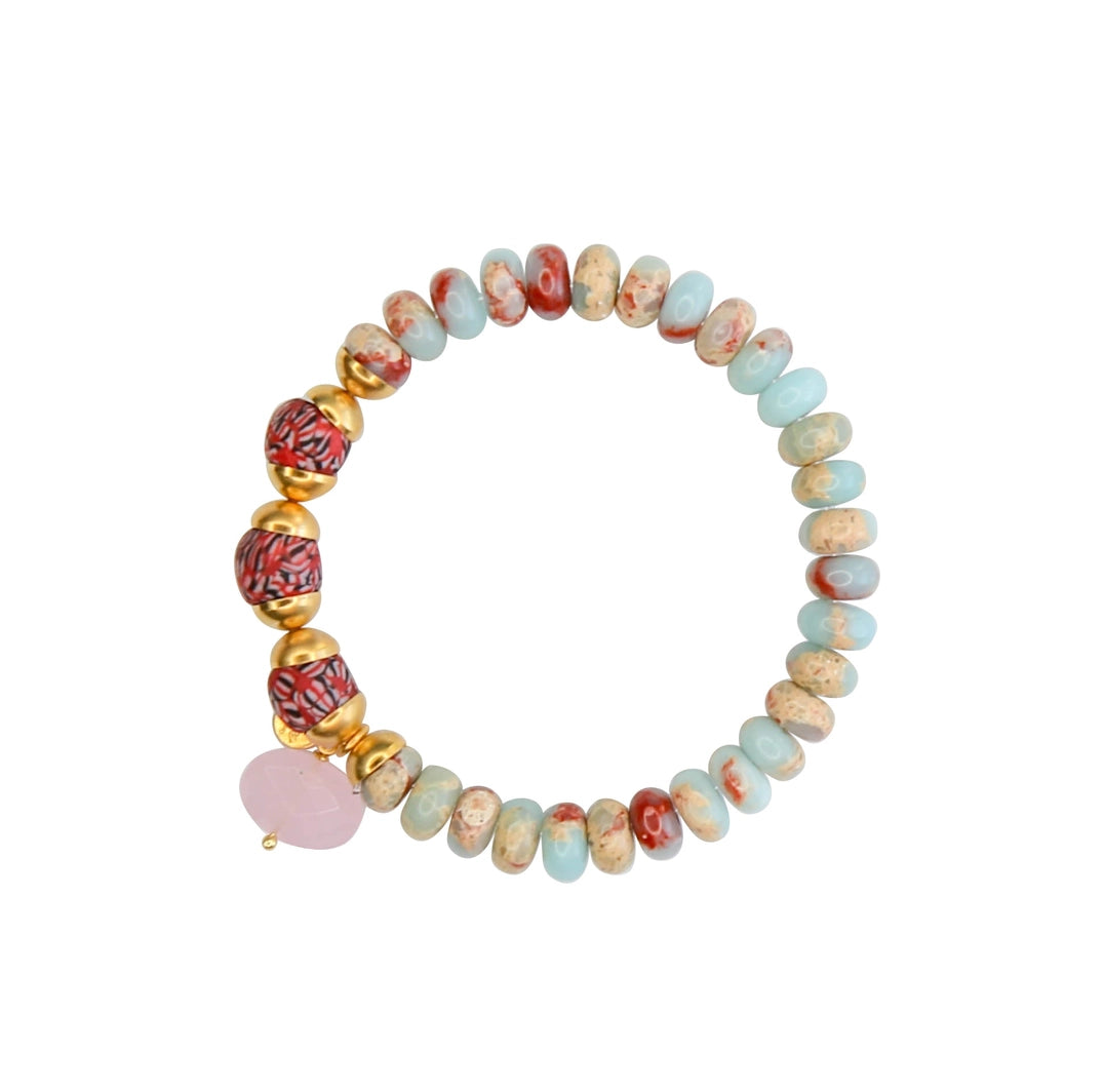 A stunning combination of bold jade beads add multi-colored African accents create a cheerful, eye-catching design. Finished with a gemstone and gold detailing, this bracelet captures the spirit of fun and individuality. Perfect for stacking or wearing on its own, it brings a lighthearted touch to your daily look. Stretch fit for ease, designed for everyday wear.