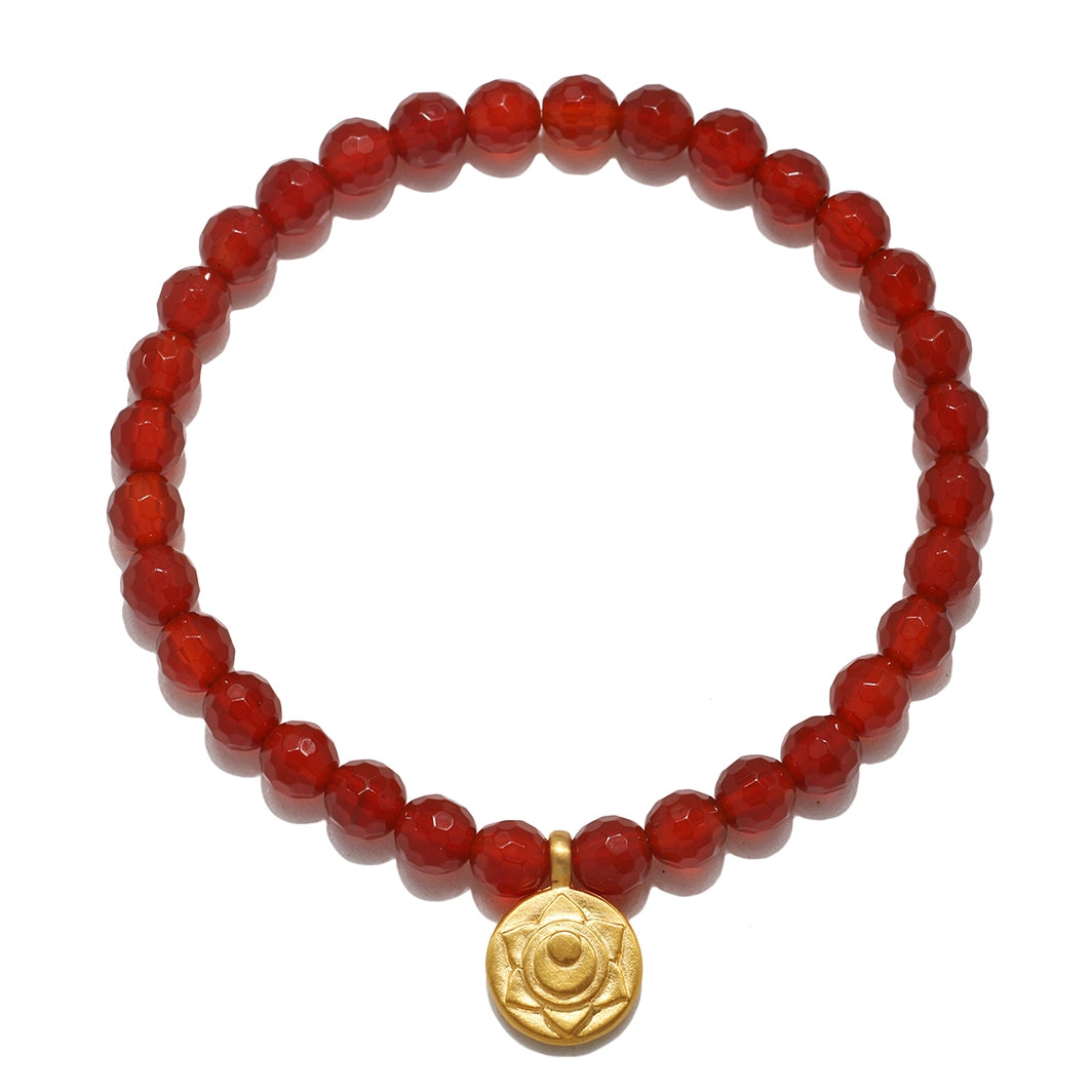 Honor your creative journey and delight in the beauty that reveals itself along the way. This healing gemstone stretch bracelet of carnelian—stone of protection, stability, and calm—helps support the sacral chakra, a sacred energy center in the body that rules creativity, sexuality, and desires. An 18kt gold plated charm is engraved with the symbol for the crown chakra. When our 7 chakras are aligned and open, we move in harmony with the world, both physically and spiritually.