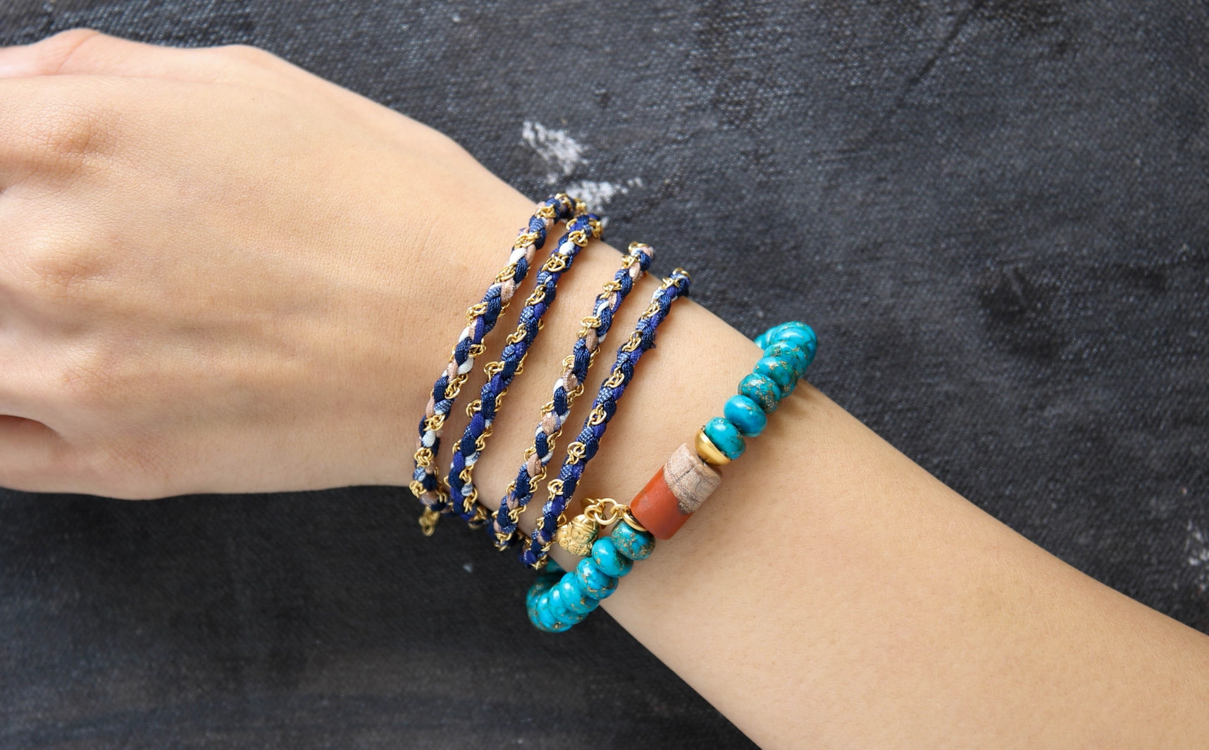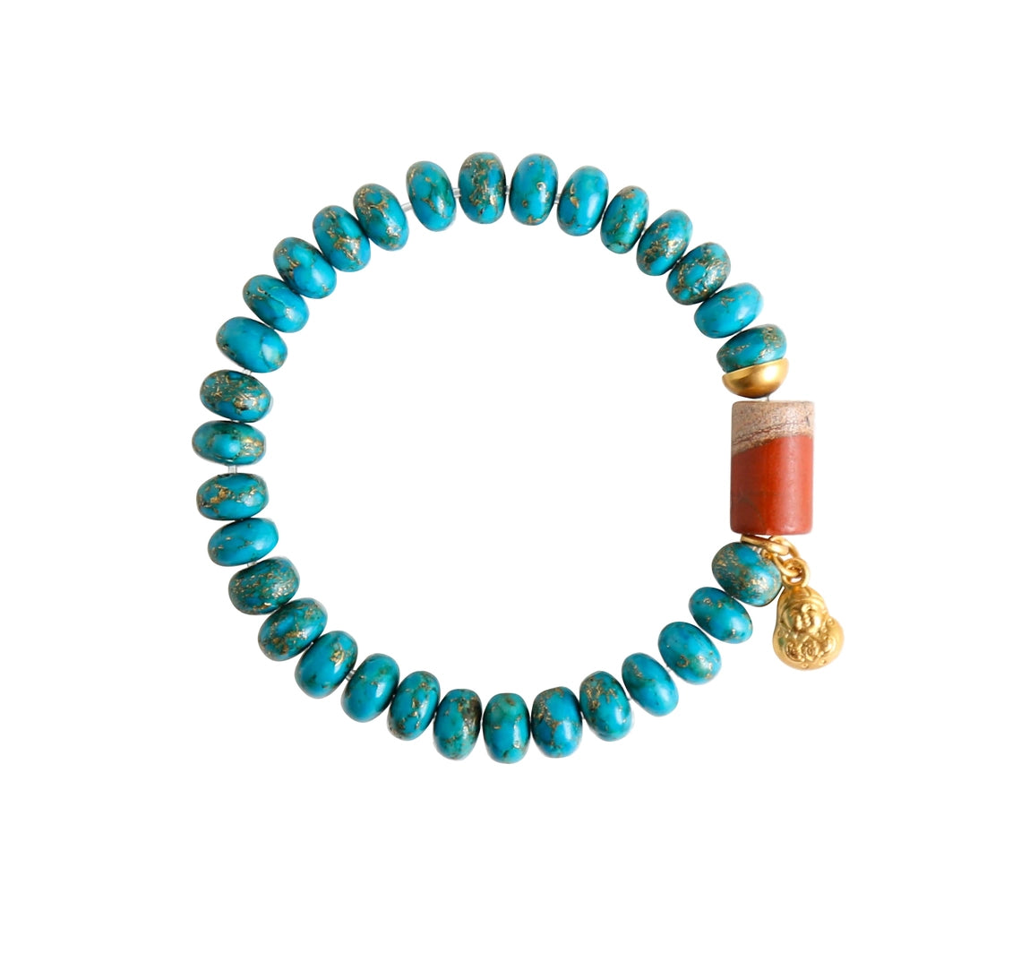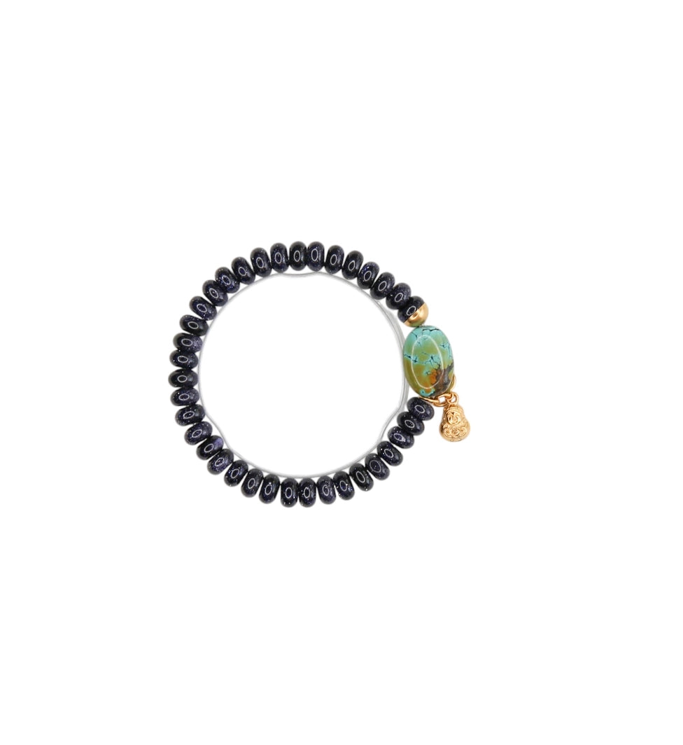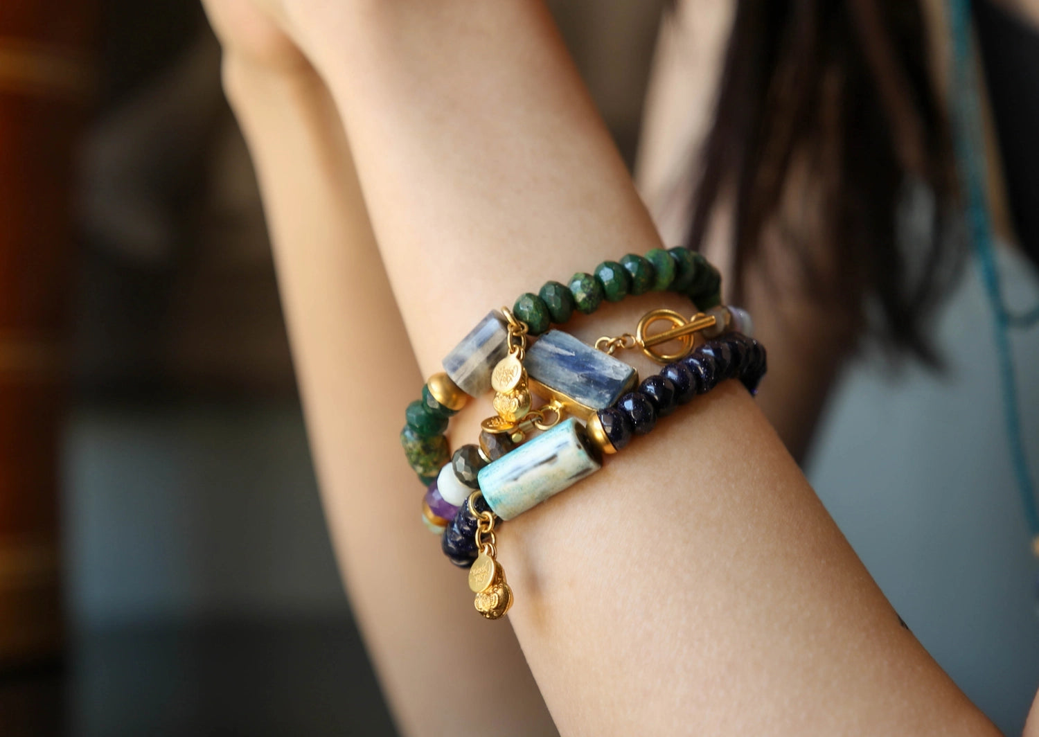 Bold yet effortless, the Dharma bracelet is a grounding presence on the wrist. Rich blue beads form a rhythmic circle, punctuated by a contrasting focal bead with golden accents. A trio of petite charms adds movement and meaning, creating a piece that layers beautifully or stands alone with quiet confidence. Stretch fit for ease, designed for everyday wear. Handmade in USA.