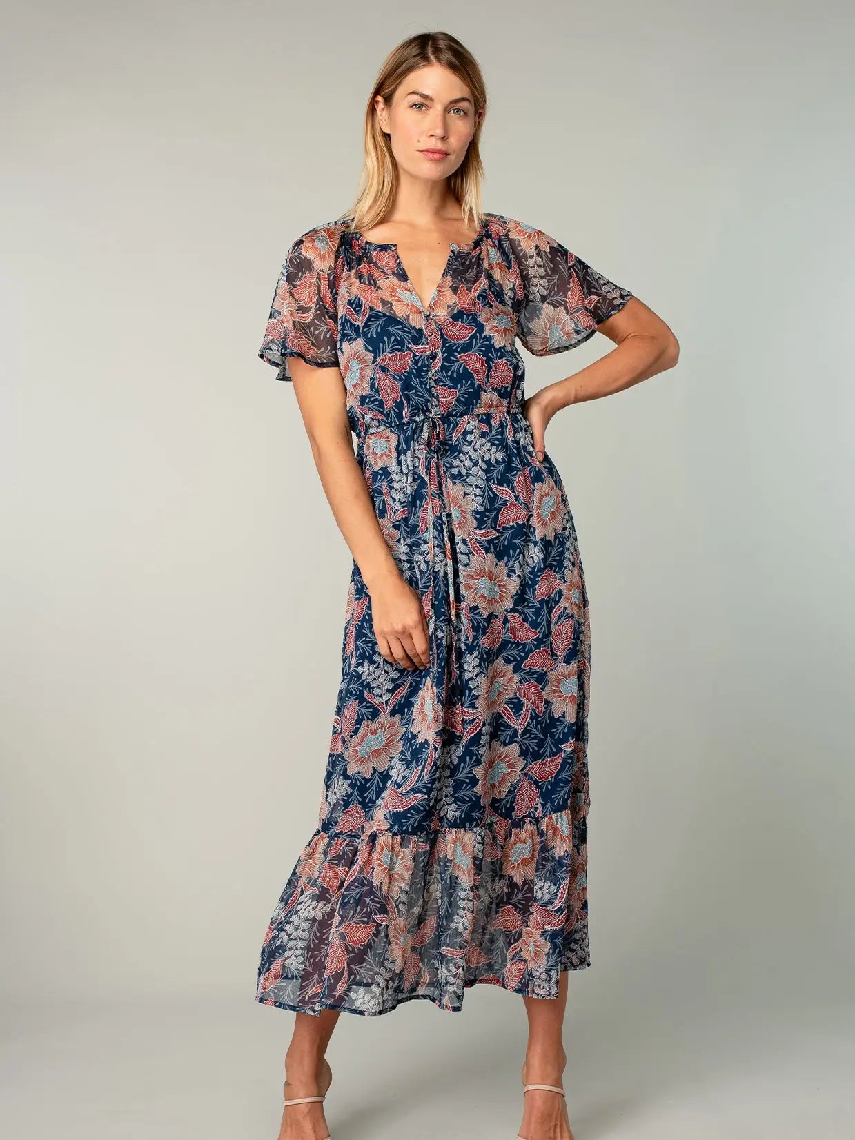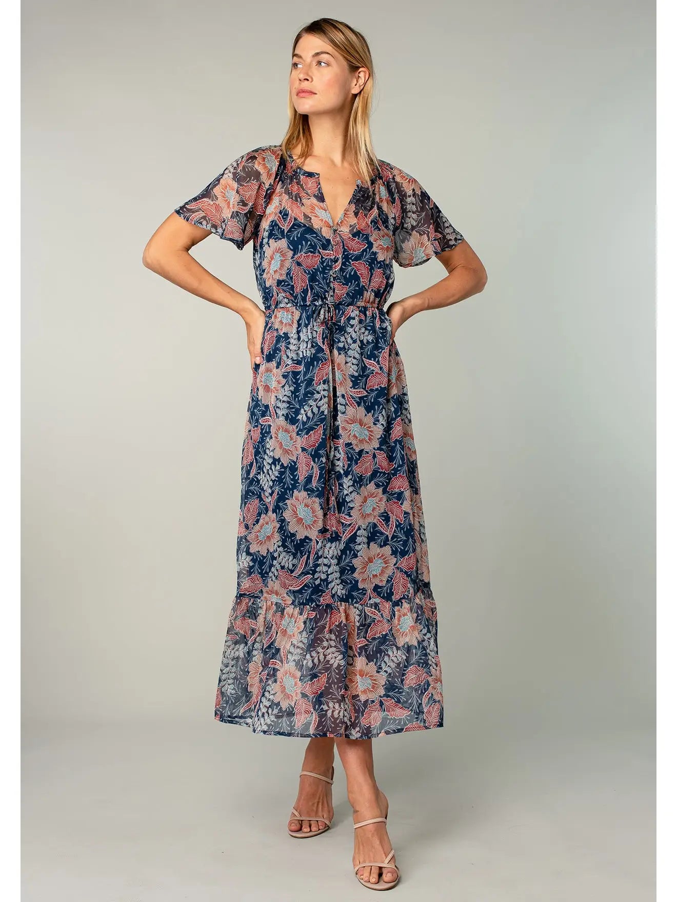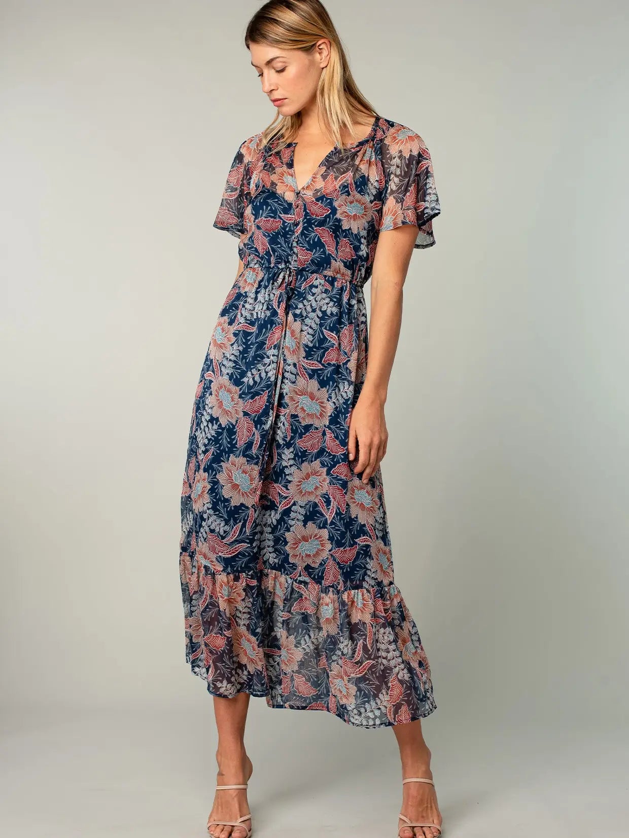Sheer, chiffon, floral maxi dress with a split neckline, ruffled hem, and short flutter sleeves. Features a partial button front, back elastic waist, and adjustable tie front. Detachable lining.