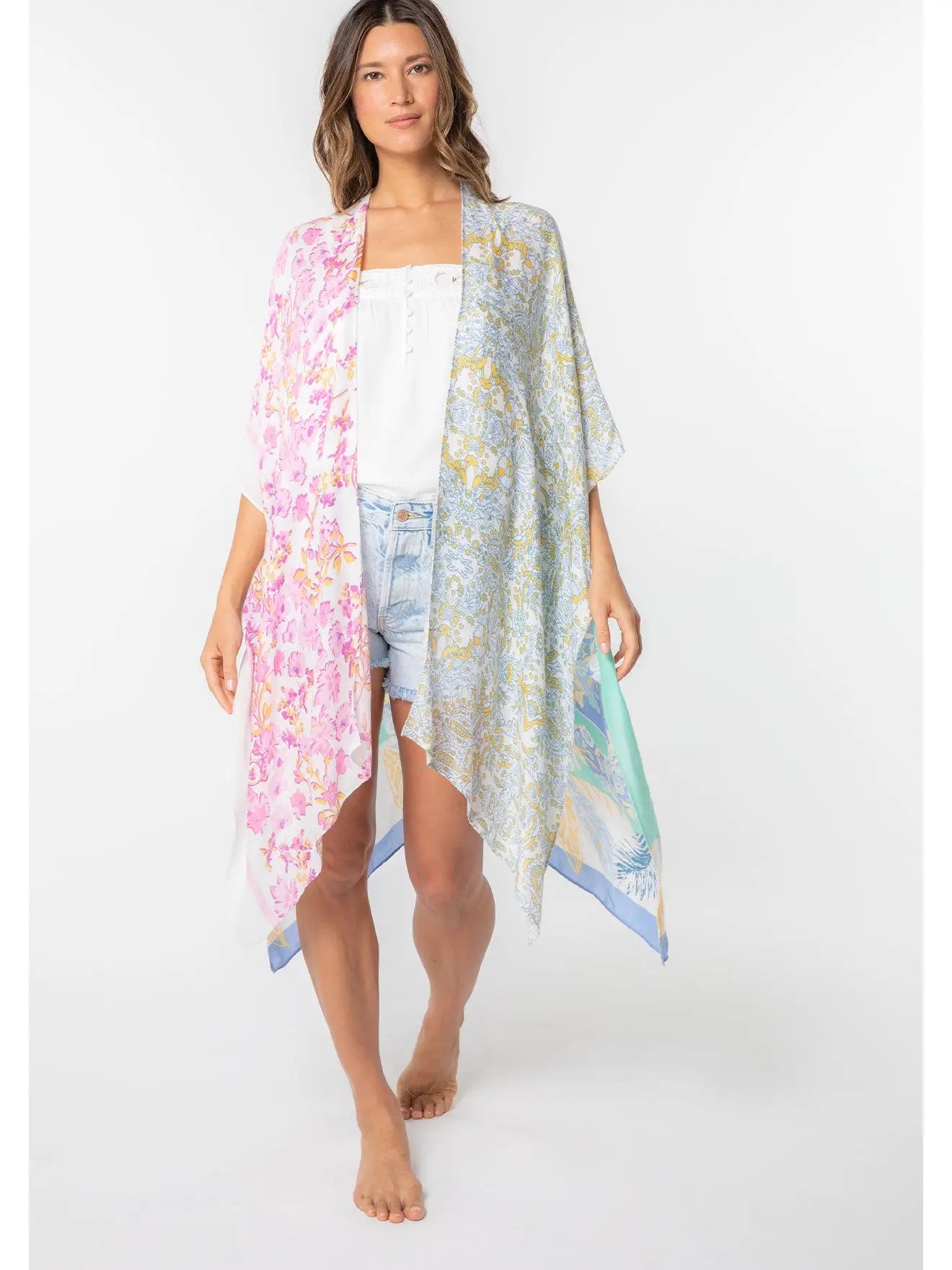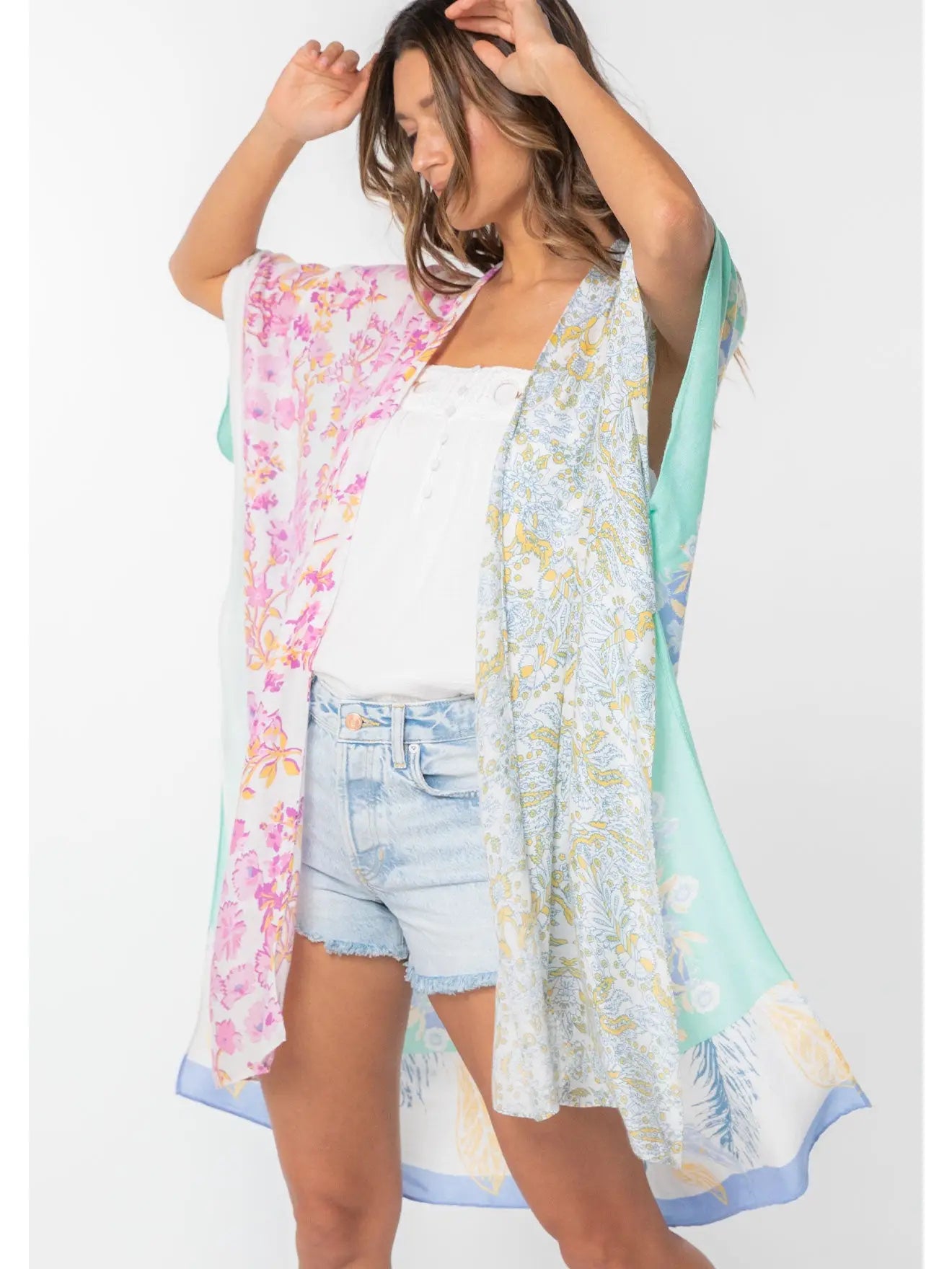 Beautiful floral mix print kimono featuring an open front, side slits, and flowy kimono sleeves. A versatile bohemian kimono perfect for the Summer days.