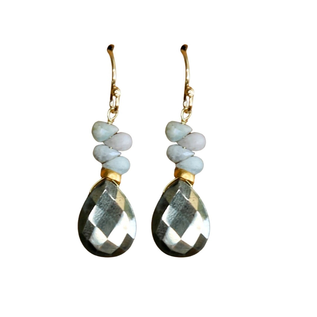 These earrings feature faceted stones that "glimmer" with a soft, natural glow, stacked like a graceful waltz of light and texture. Anchoring the tiny design is a single drop that adds depth and contrast.