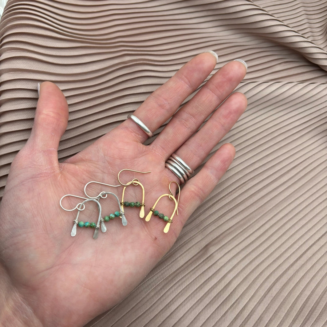 Little gold or silver pendants with wire wrapped beads hang from 14 karat gold-filled or sterling silver ear wire.