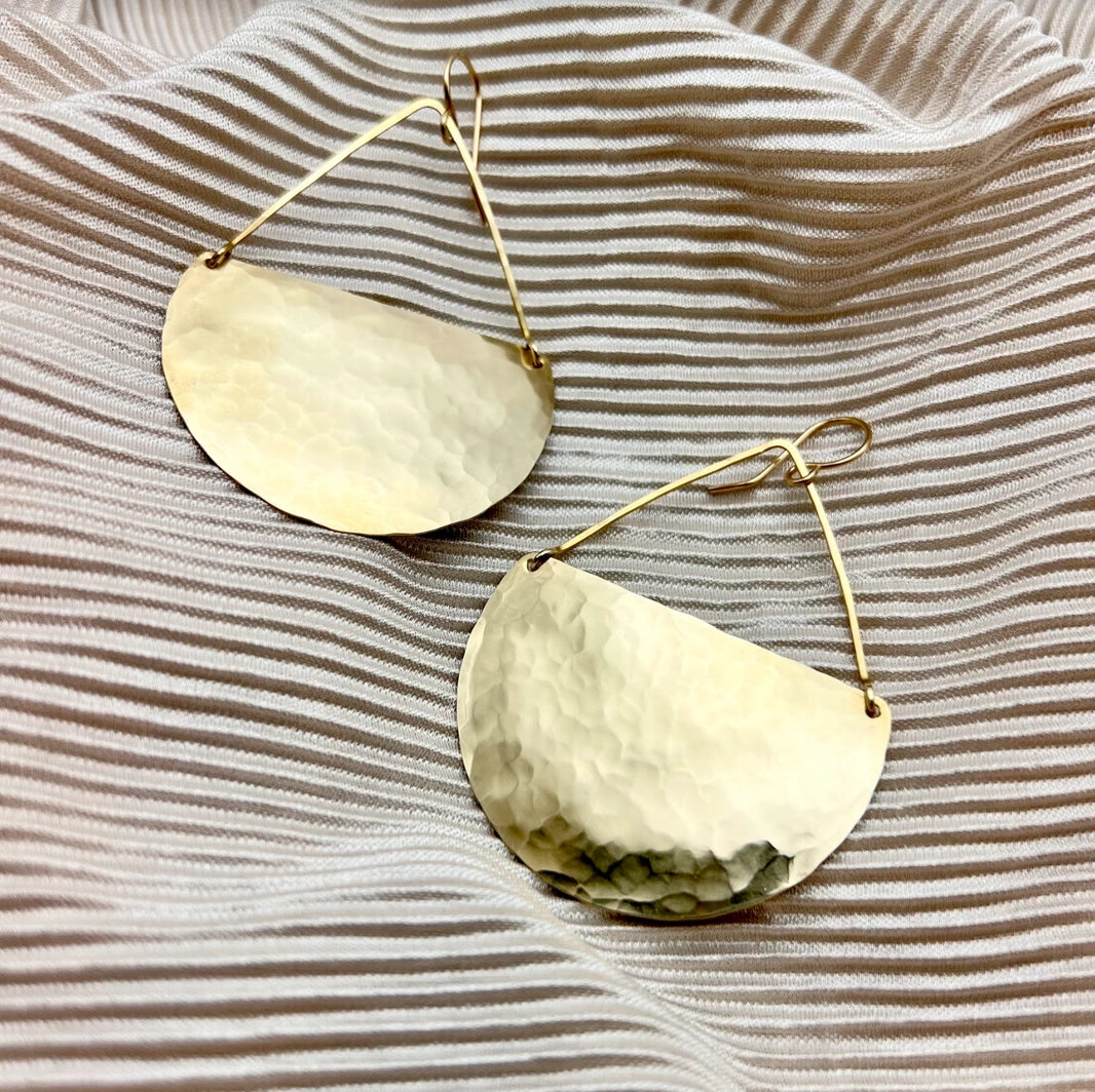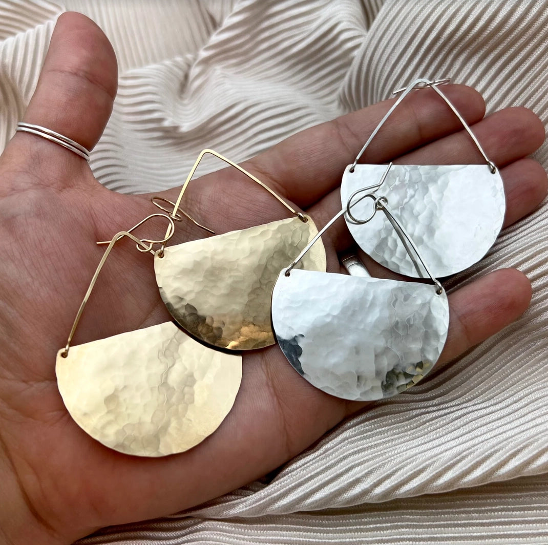 Hammered gold or silver pendants that hang from 14 karat gold-filled or sterling silver handmade ear wire. Handmade in the USA.