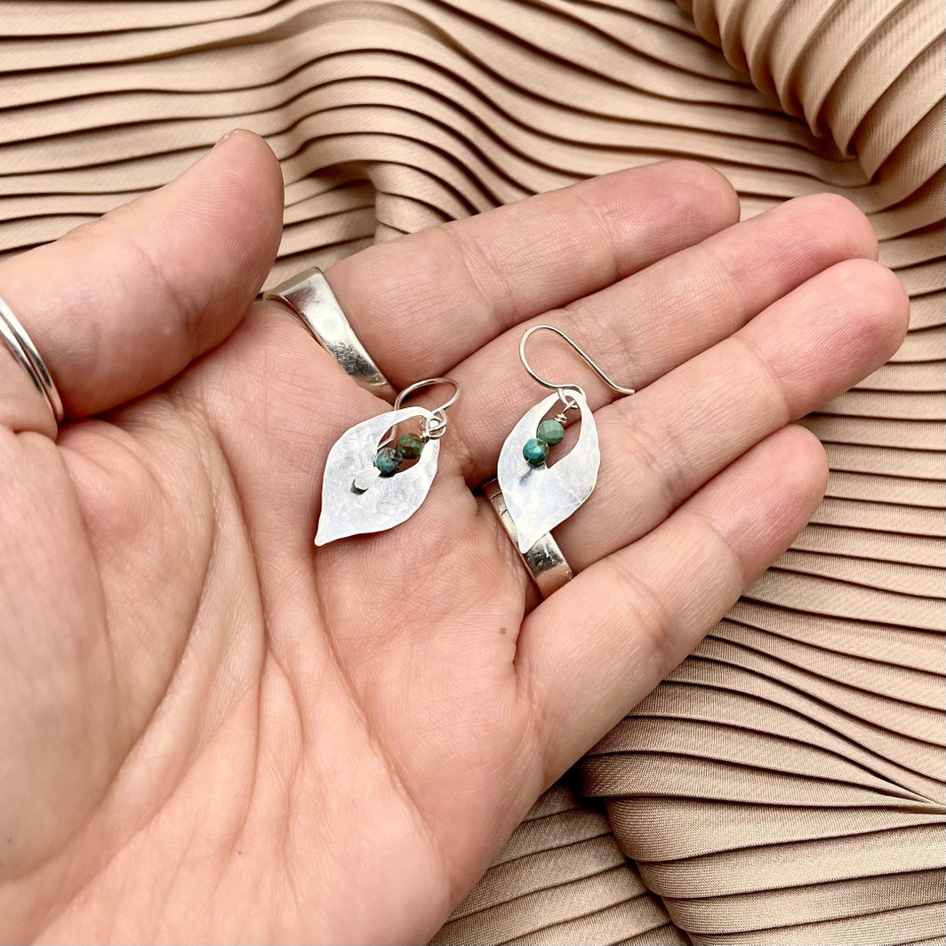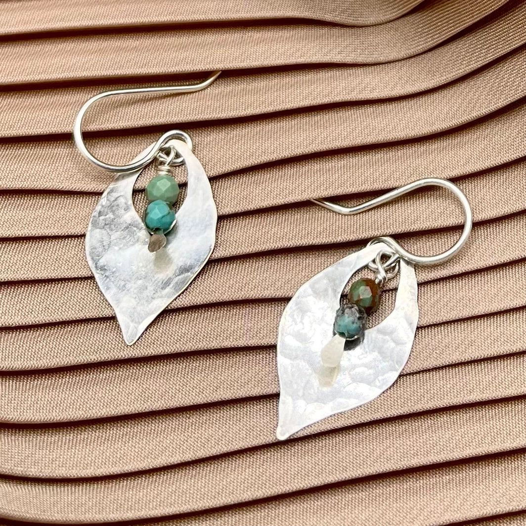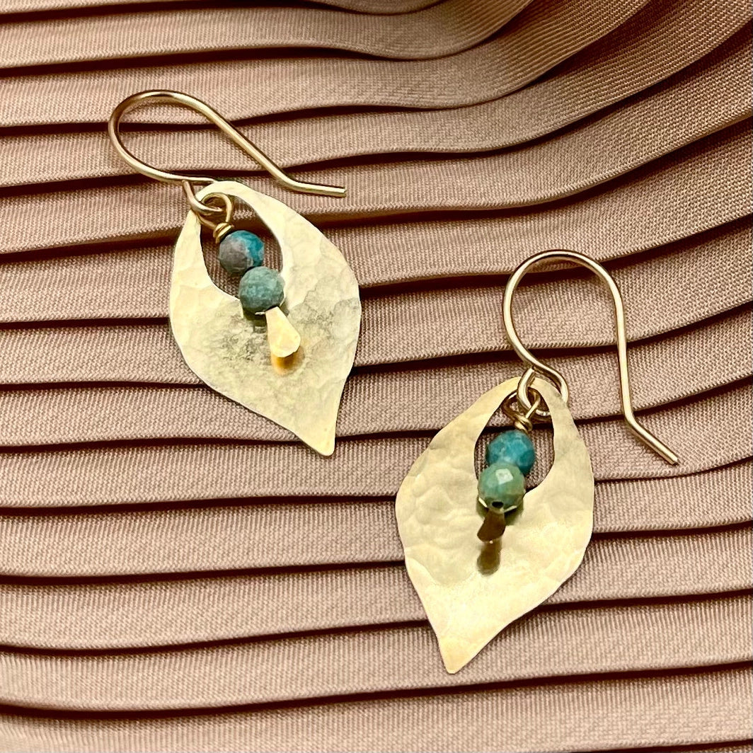 Gold or silver leaf-shaped pendants and colorful beads that hang from 14 karat gold filled or sterling silver ear wire. Handmade in the USA.