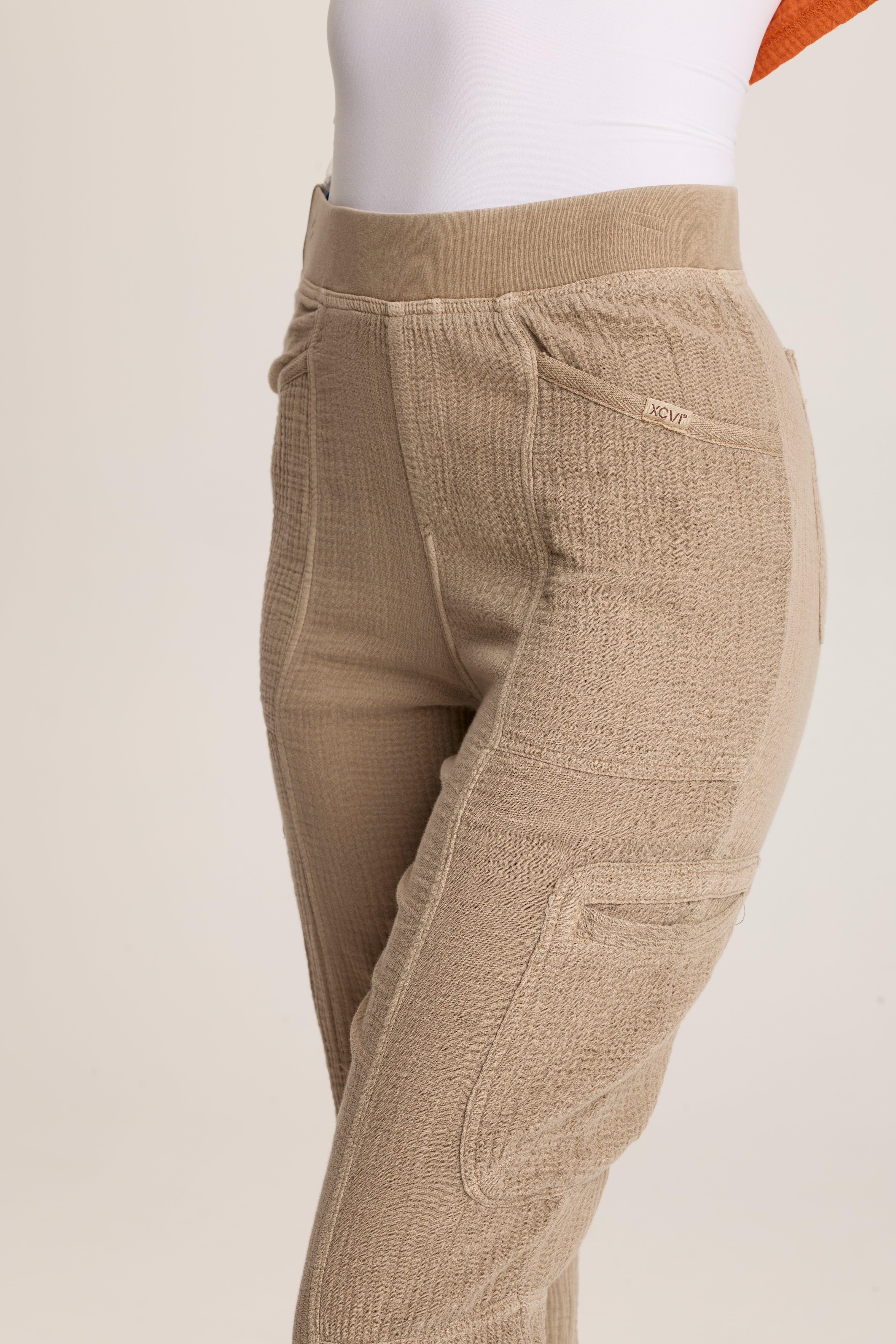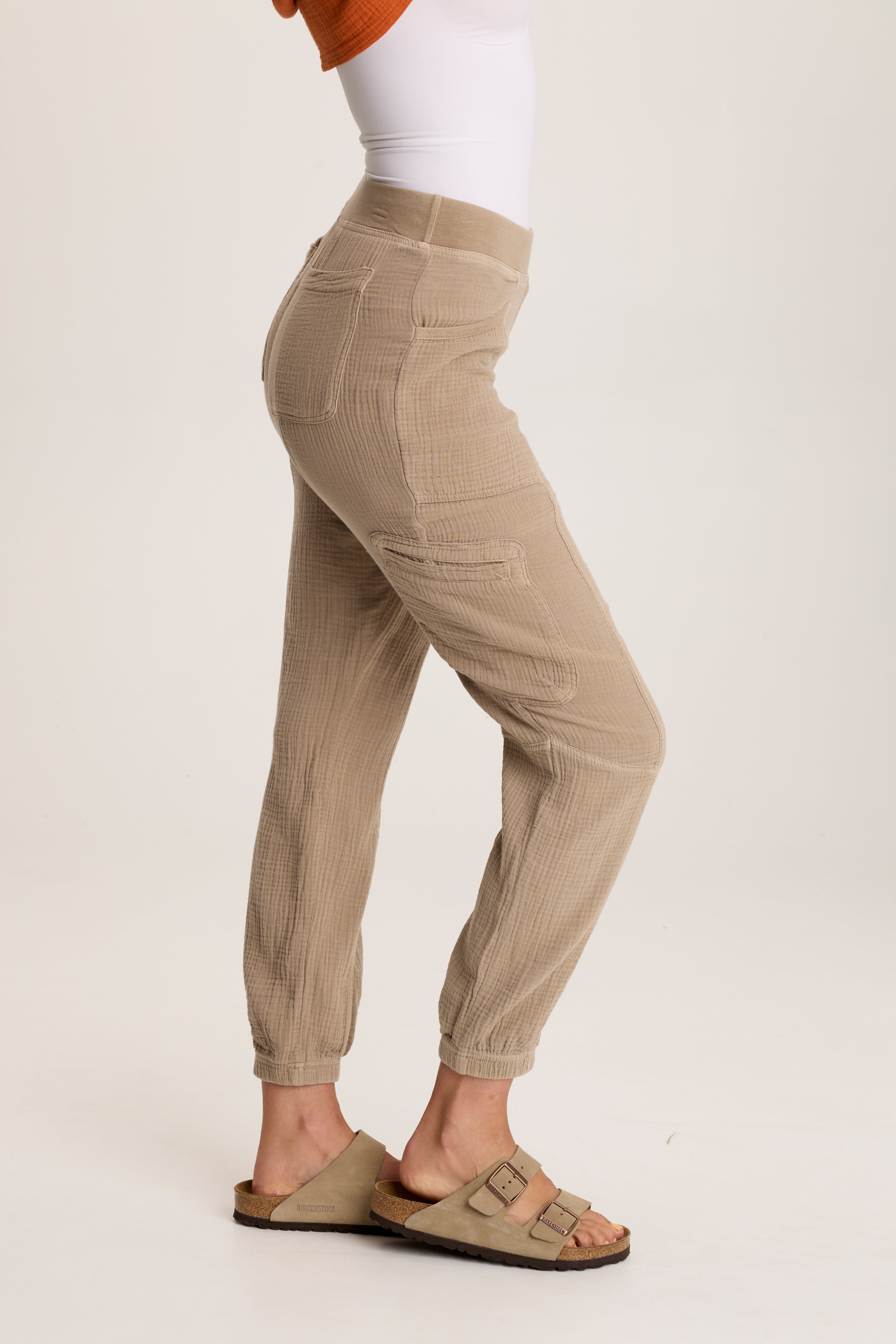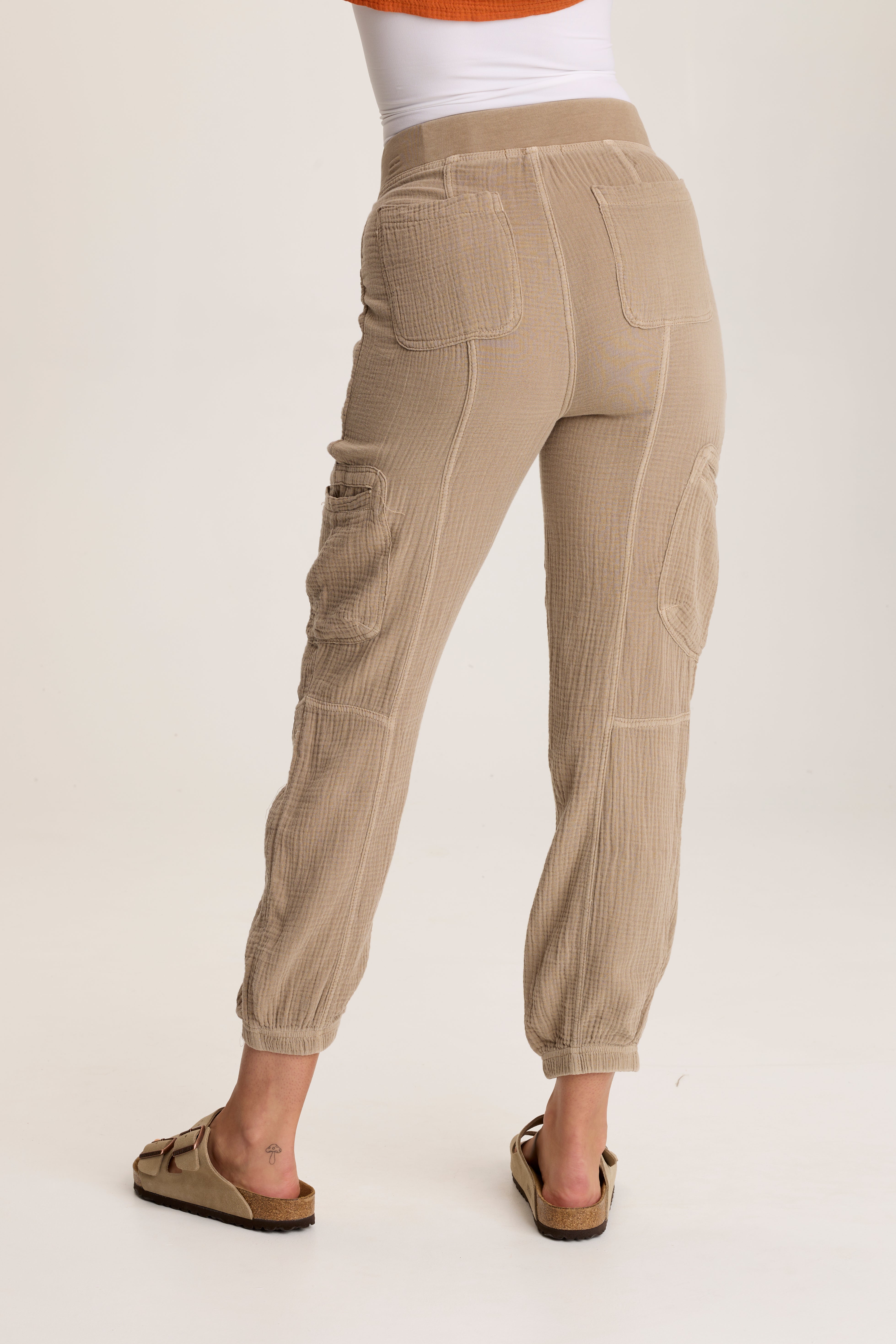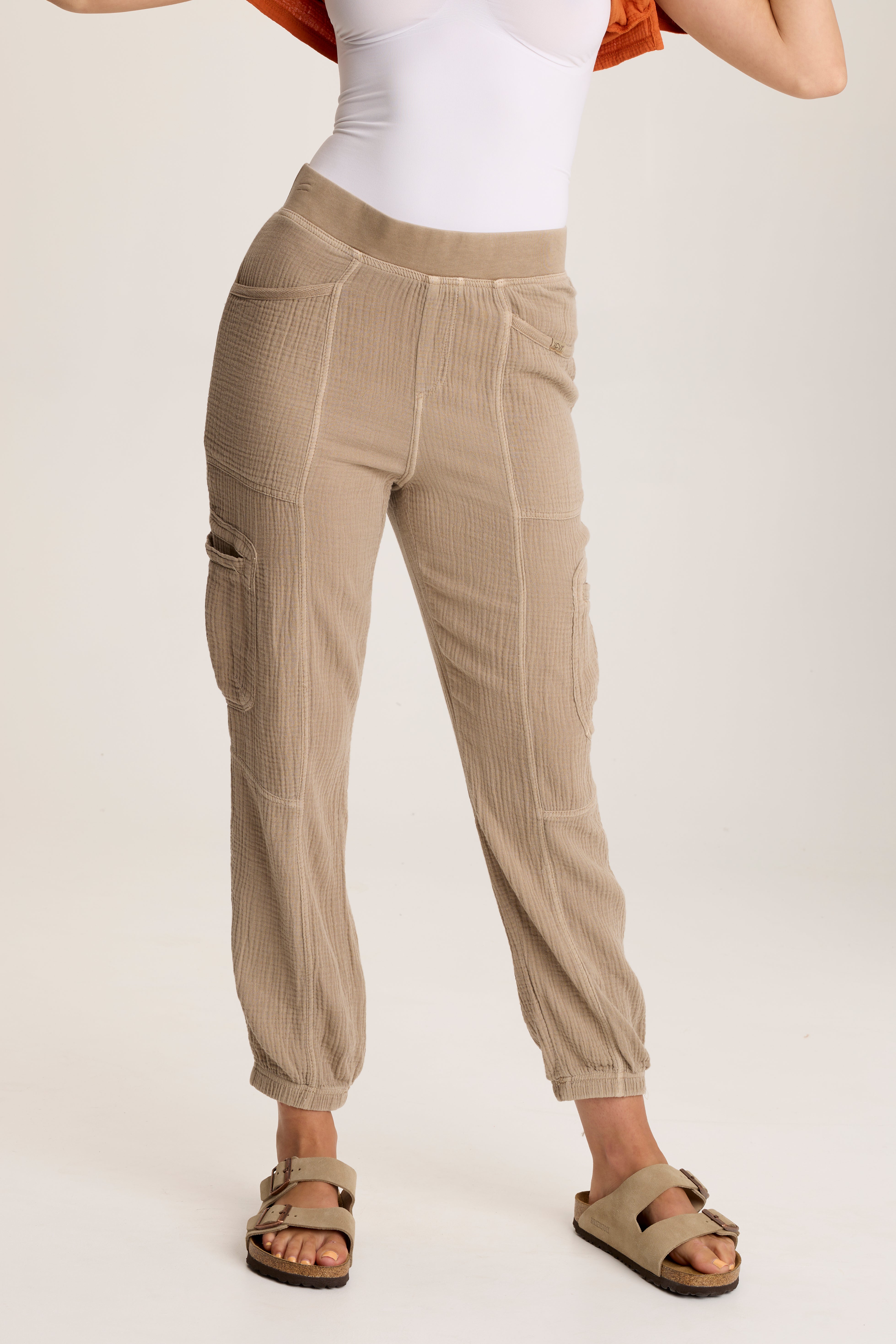 A tapered and cropped jogger-inspired silhouette, elastic pull-on waist, and multiple pockets mix the beachy-casual look with sport influence.