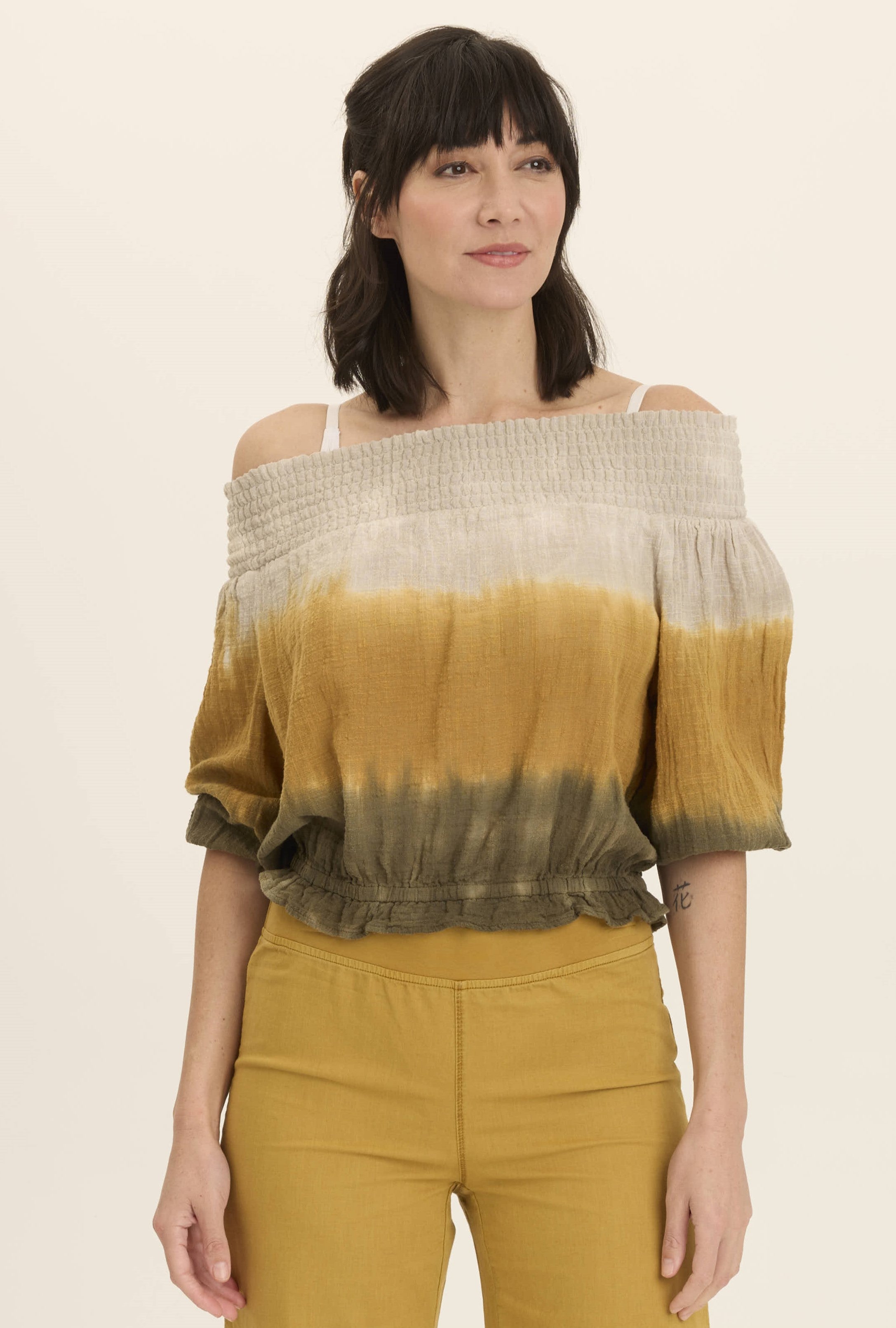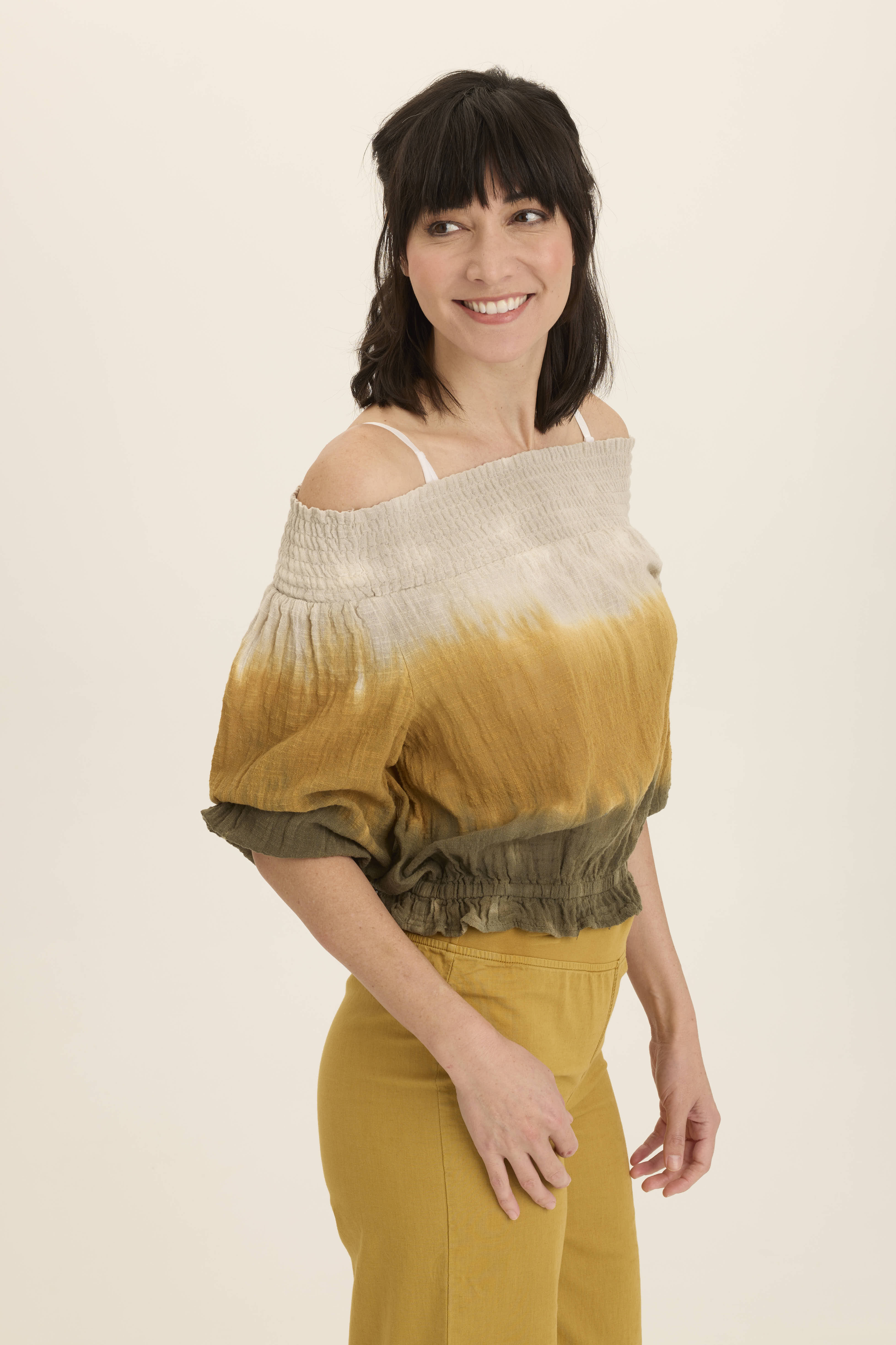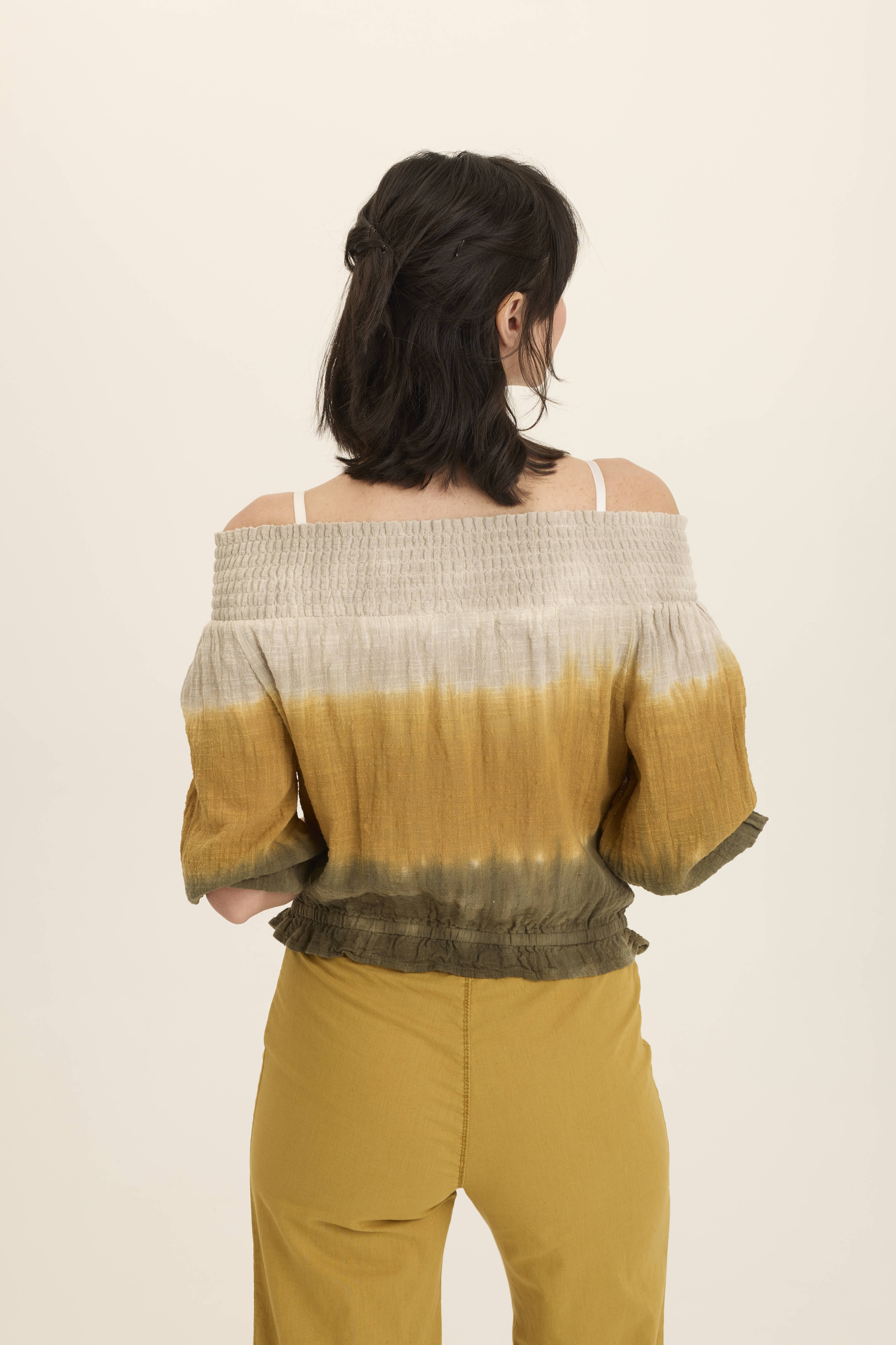 Billowing three-quarter sleeves with elastic bands pair up with layered elastic shirring at the neck so Jolia can be worn on or off the shoulder. A banded ruffle hem finishes this semi-cropped Cocoon Gauze style.