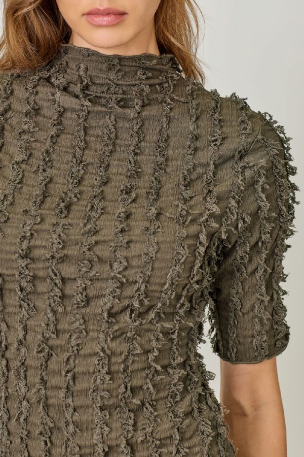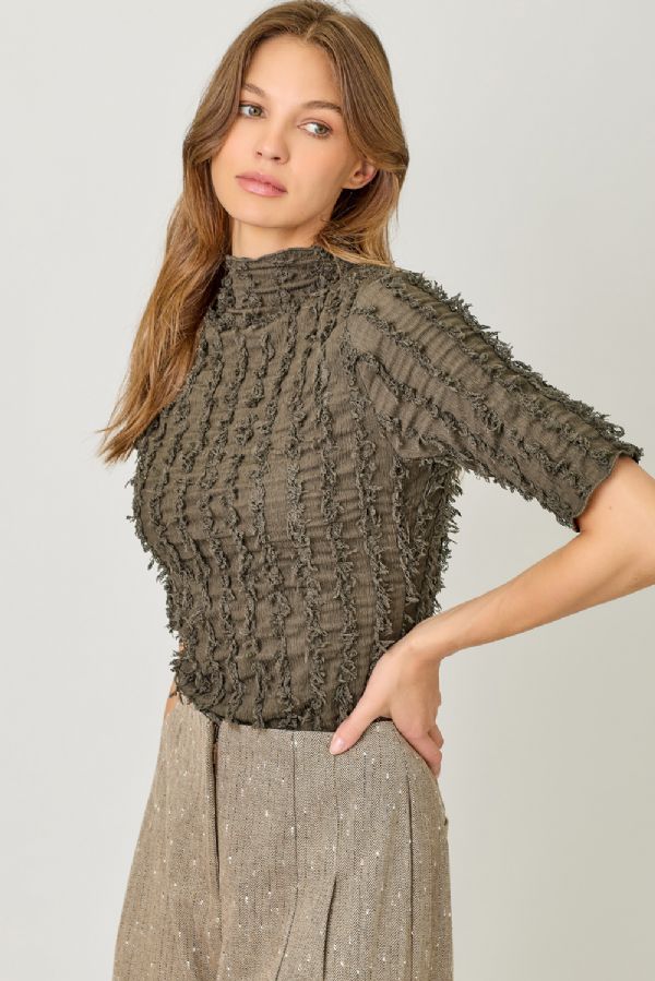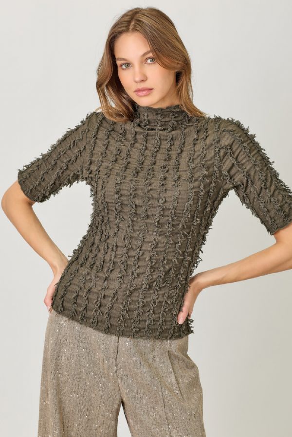 This textured knit top features a delicate lettuce edge detail, adding a stylish touch to your wardrobe essentials.