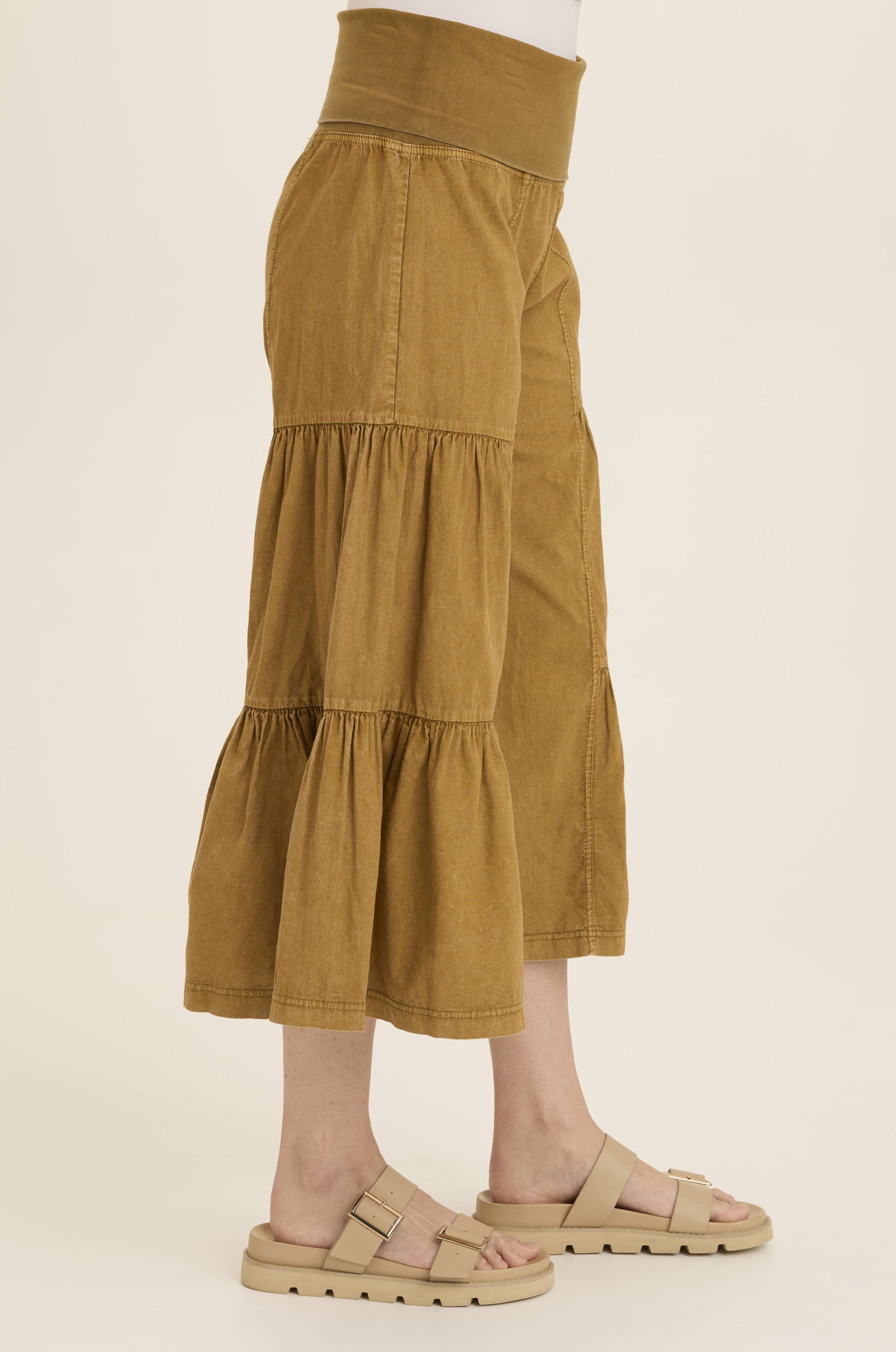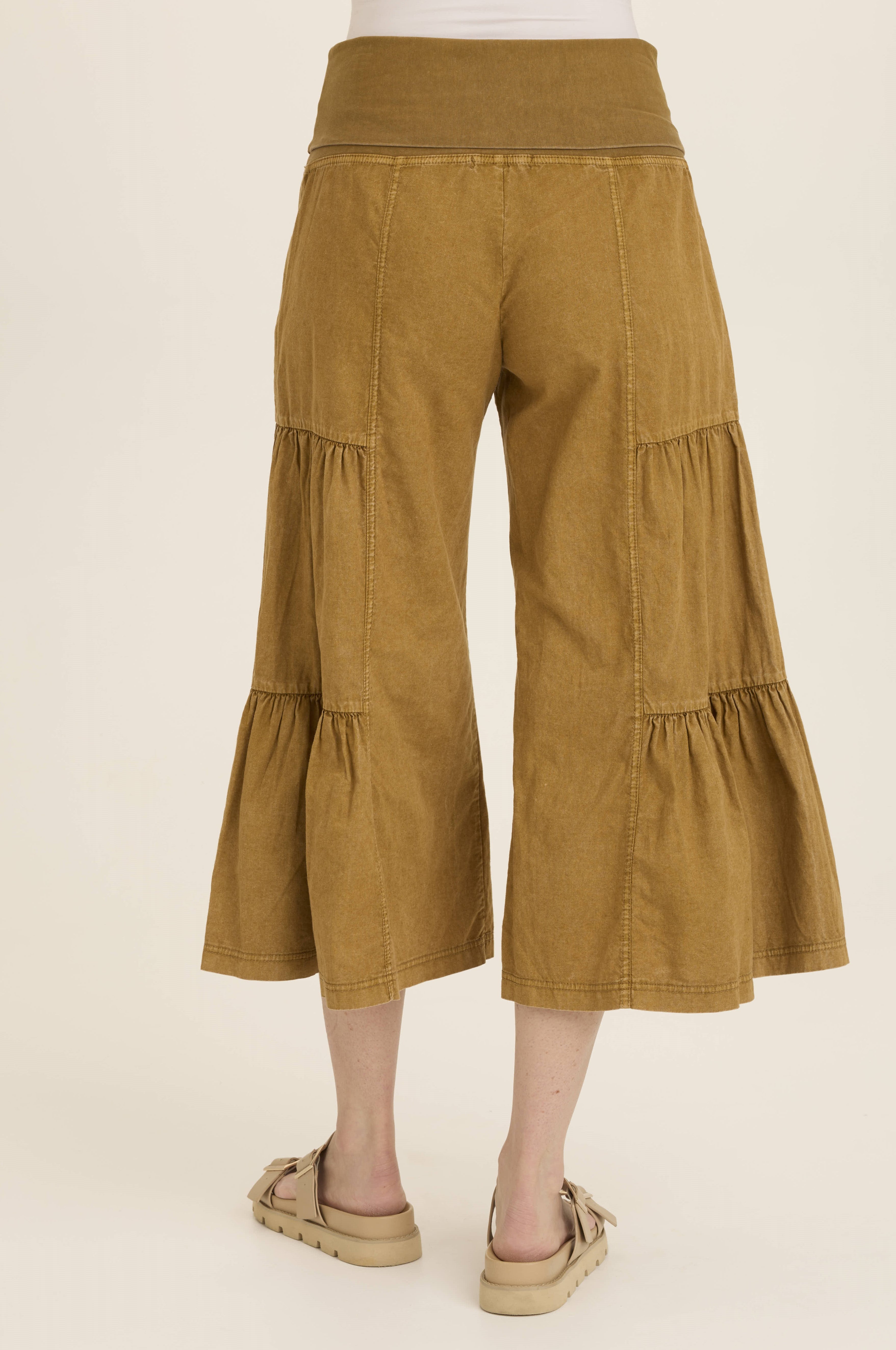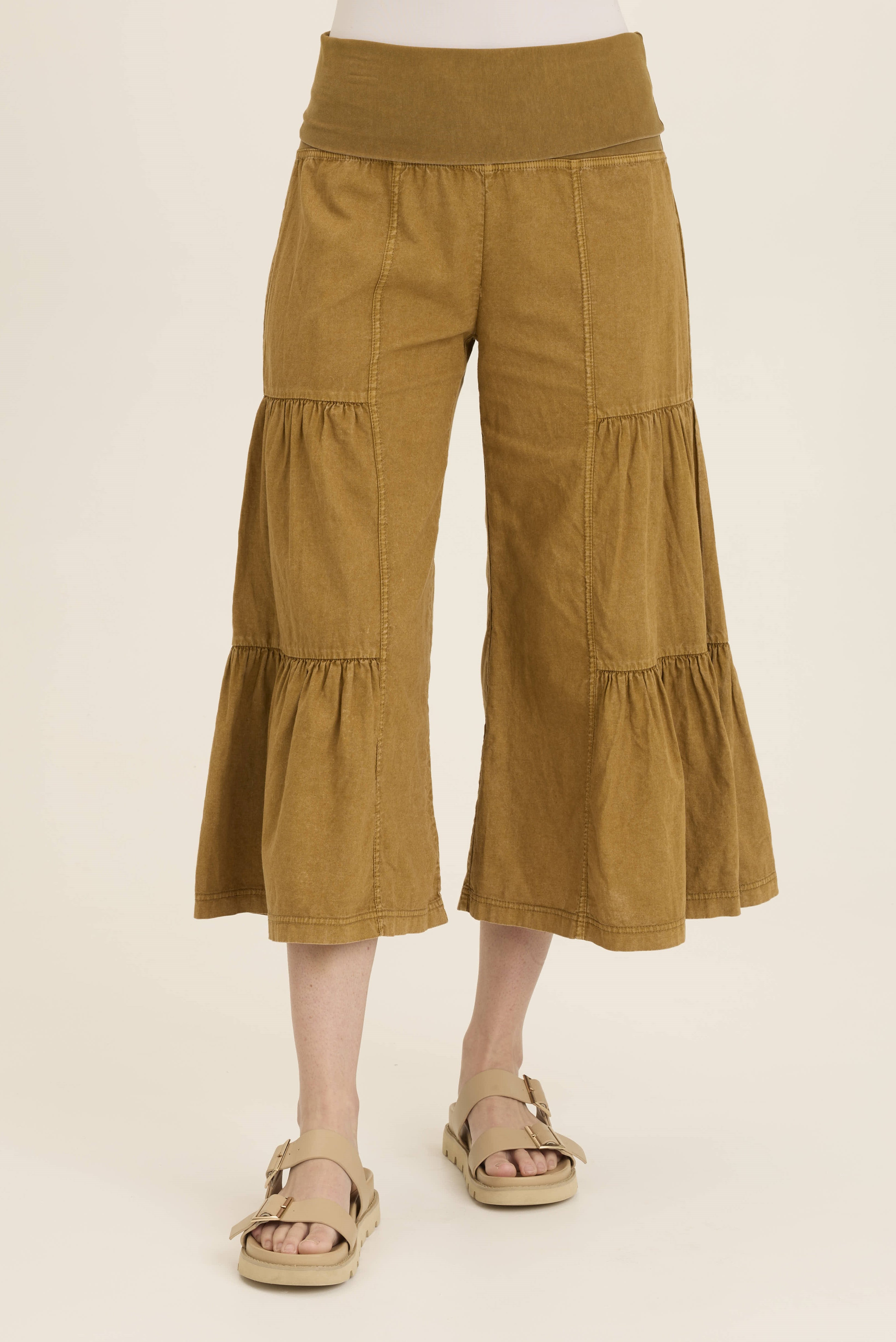 A foldover jersey waistband and tiered side panels grace this wide-leg crop. The perfect lightweight summer pant in Cotton Linen just arrived!