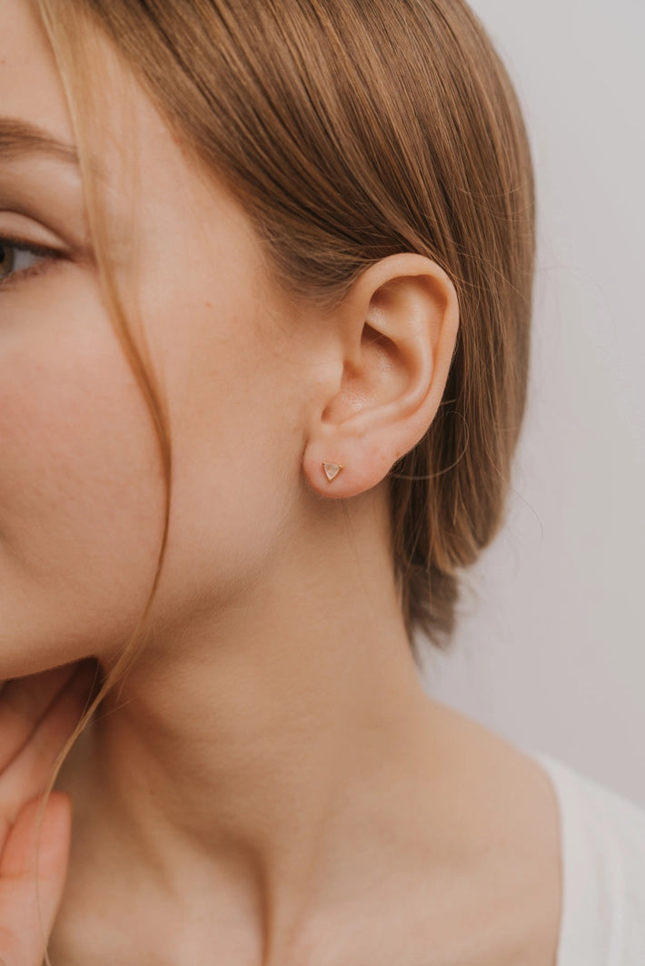 Our Mini Energy Gem studs feature a triangular stone set in a prong.