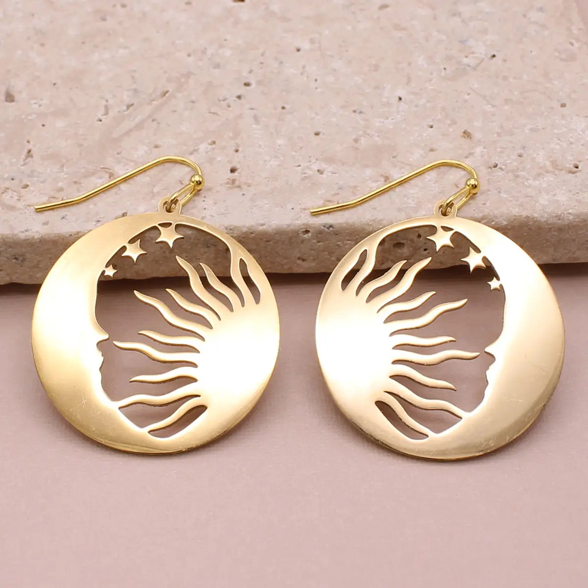 A captivating blend of celestial beauty combines to create these laser cut crescent moon and sun earrings. These heavenly earrings feature a round design with laser-cut details of a crescent moon and a radiant sun. The celestial symbols symbolize balance and vitality.