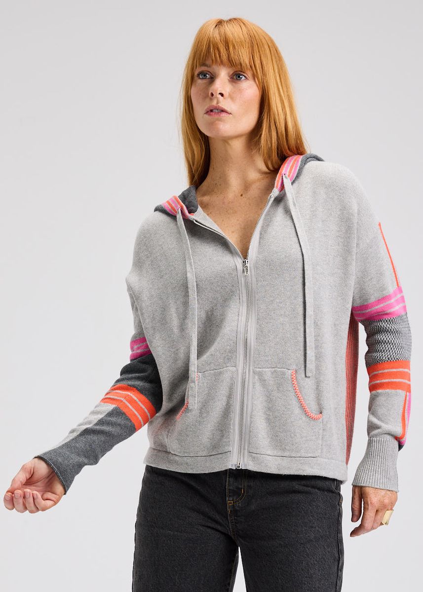 The Multi Media Hoodie features a knit construction with vibrant colors and playful design elements.