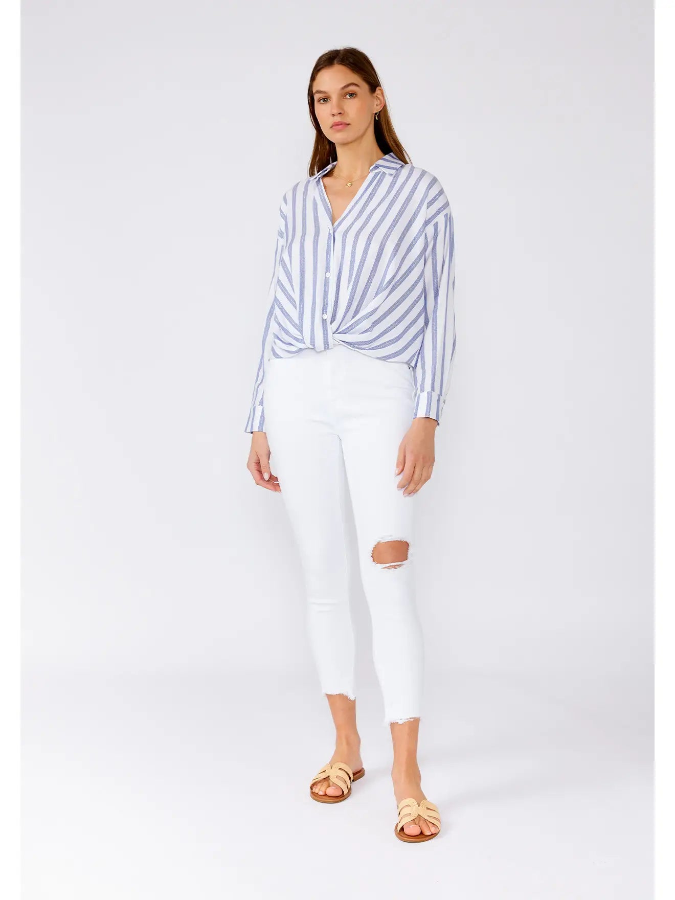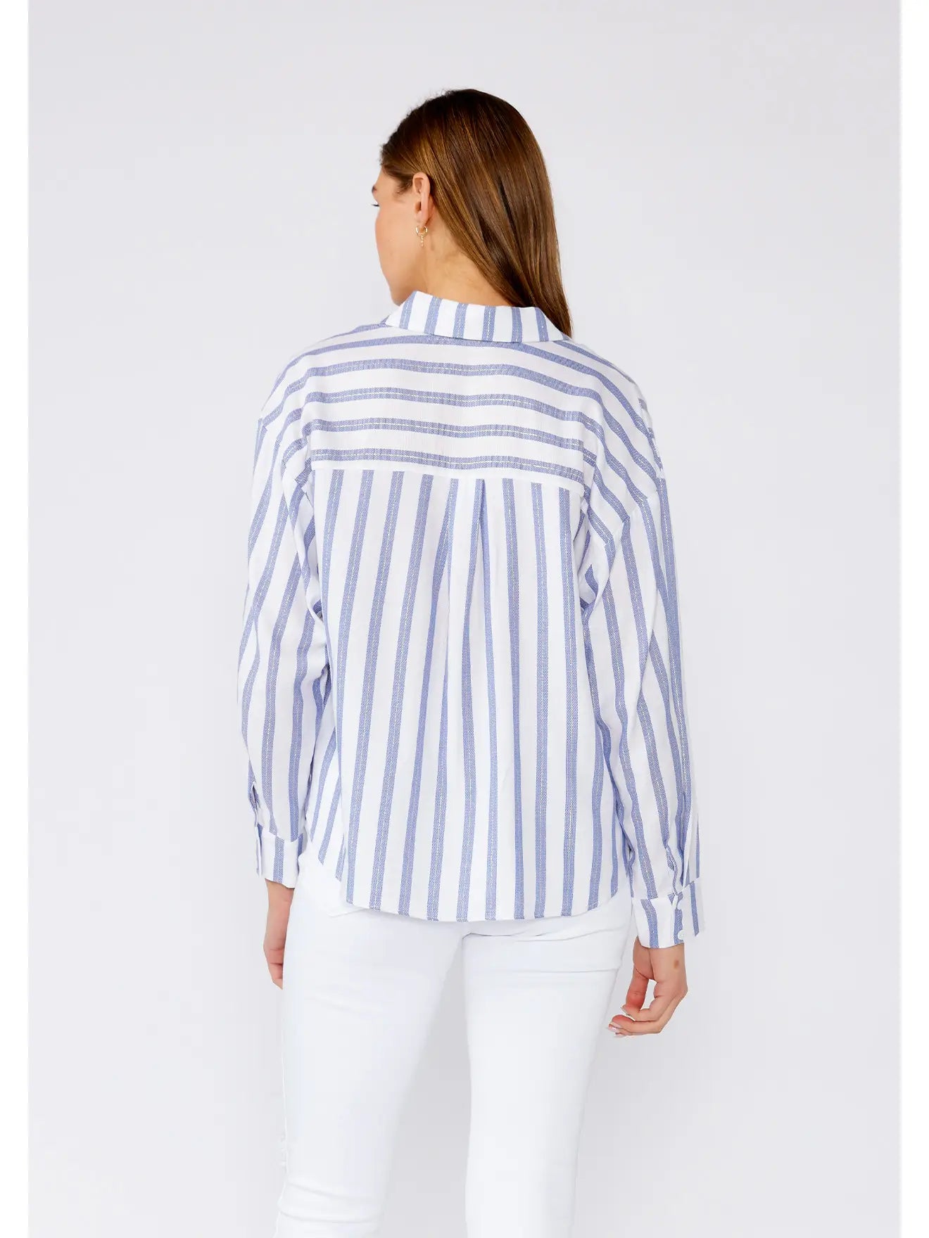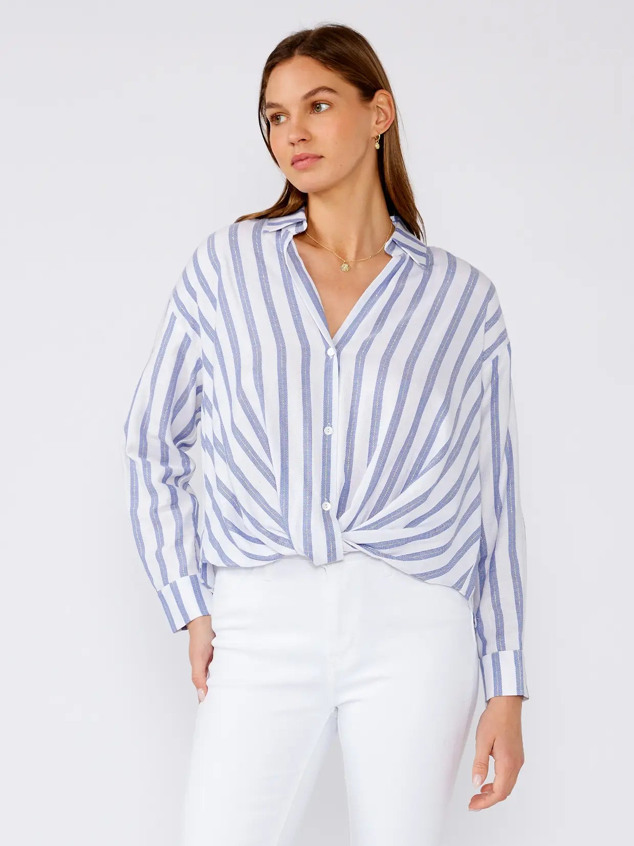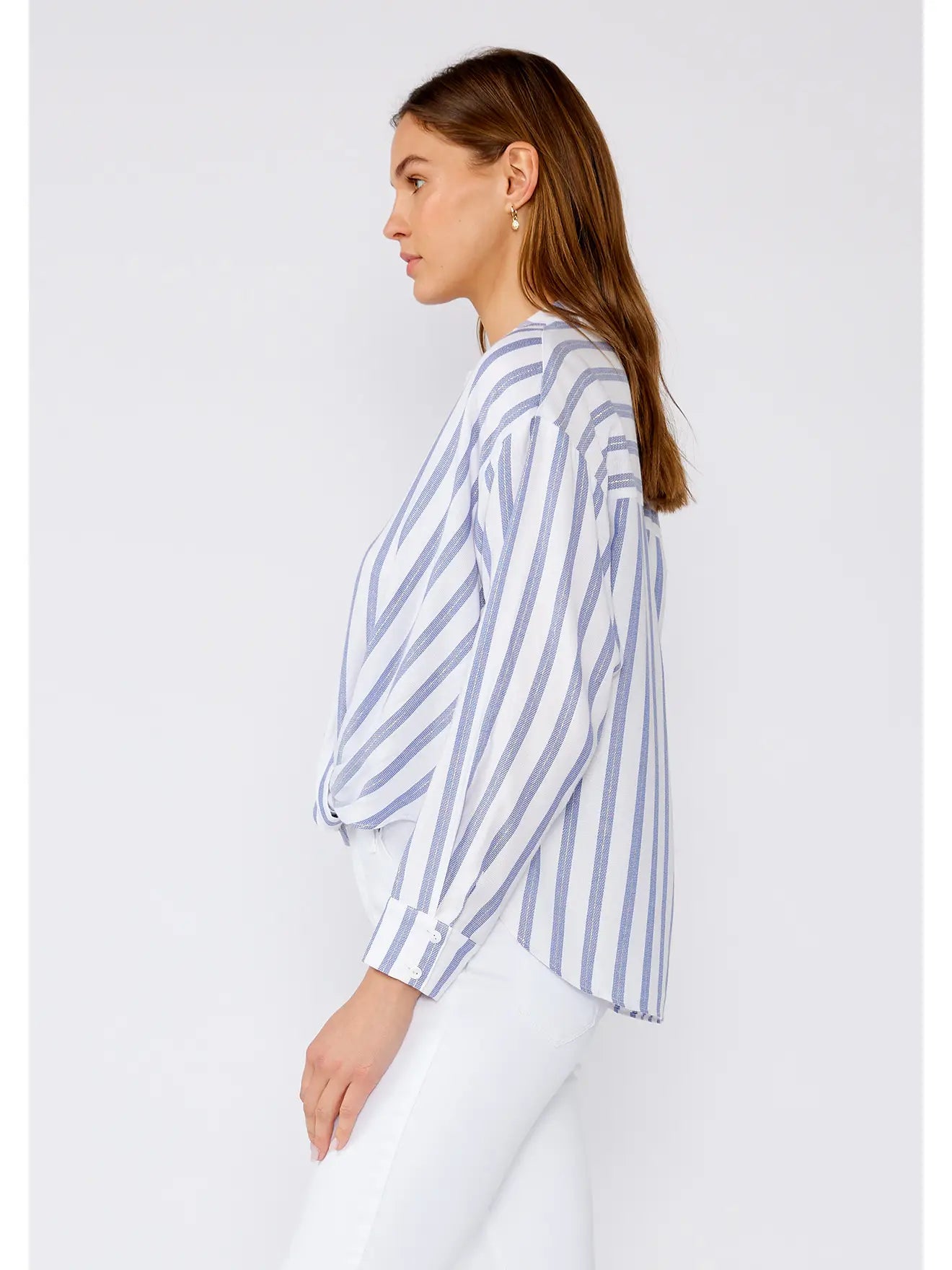 Nautical striped blouse with metallic details and a twist front. Features a collared neckline, long sleeve, button front, button cuff closure, and a high low hem.