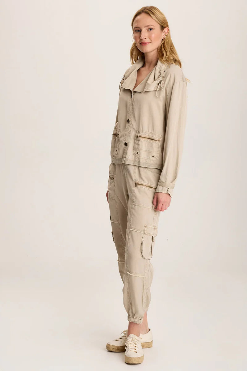 A voluminous collar with corded adjustable ruched channels, a three-brass button closure, and zippered pockets make this relaxed-fit twill style a visual feast!