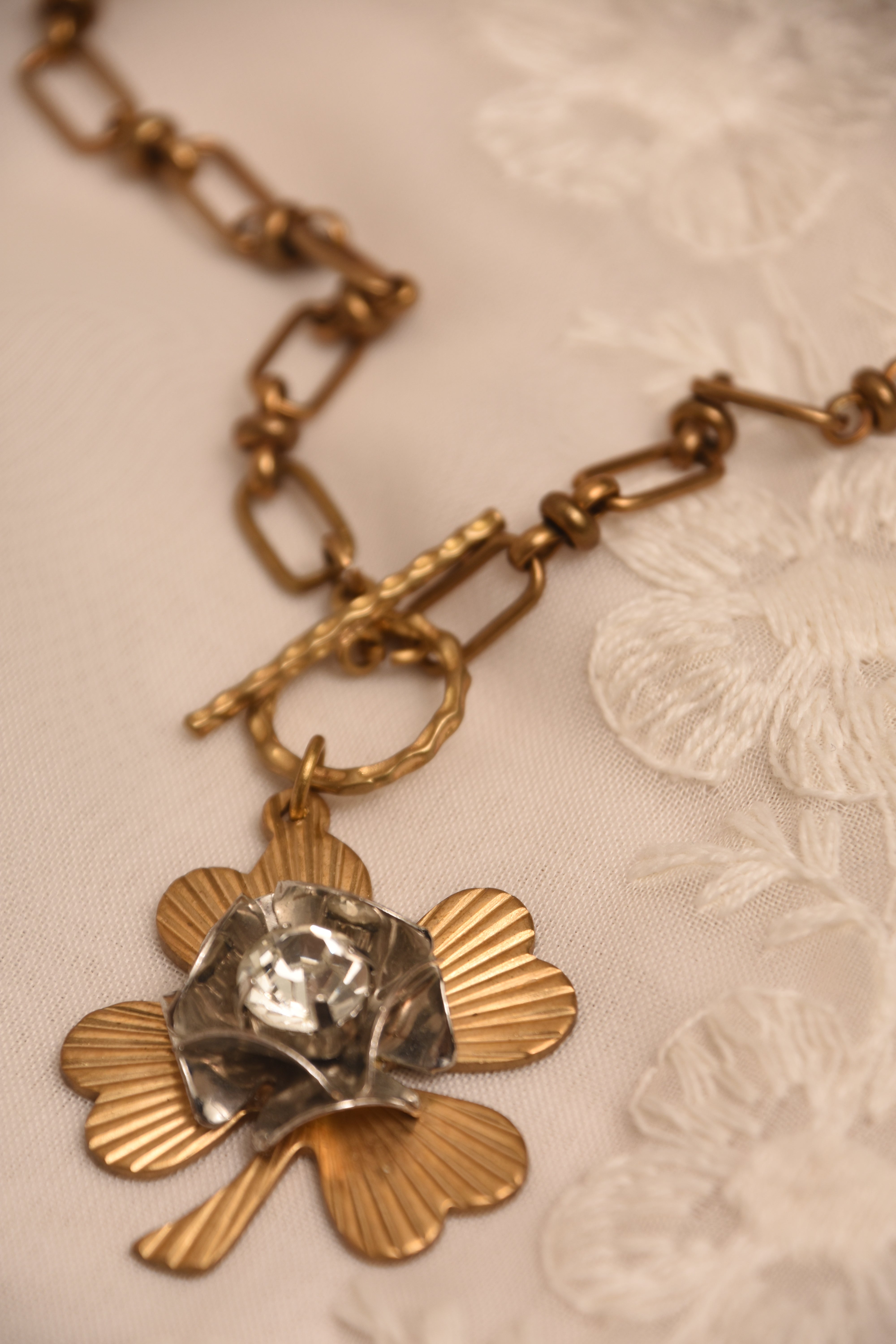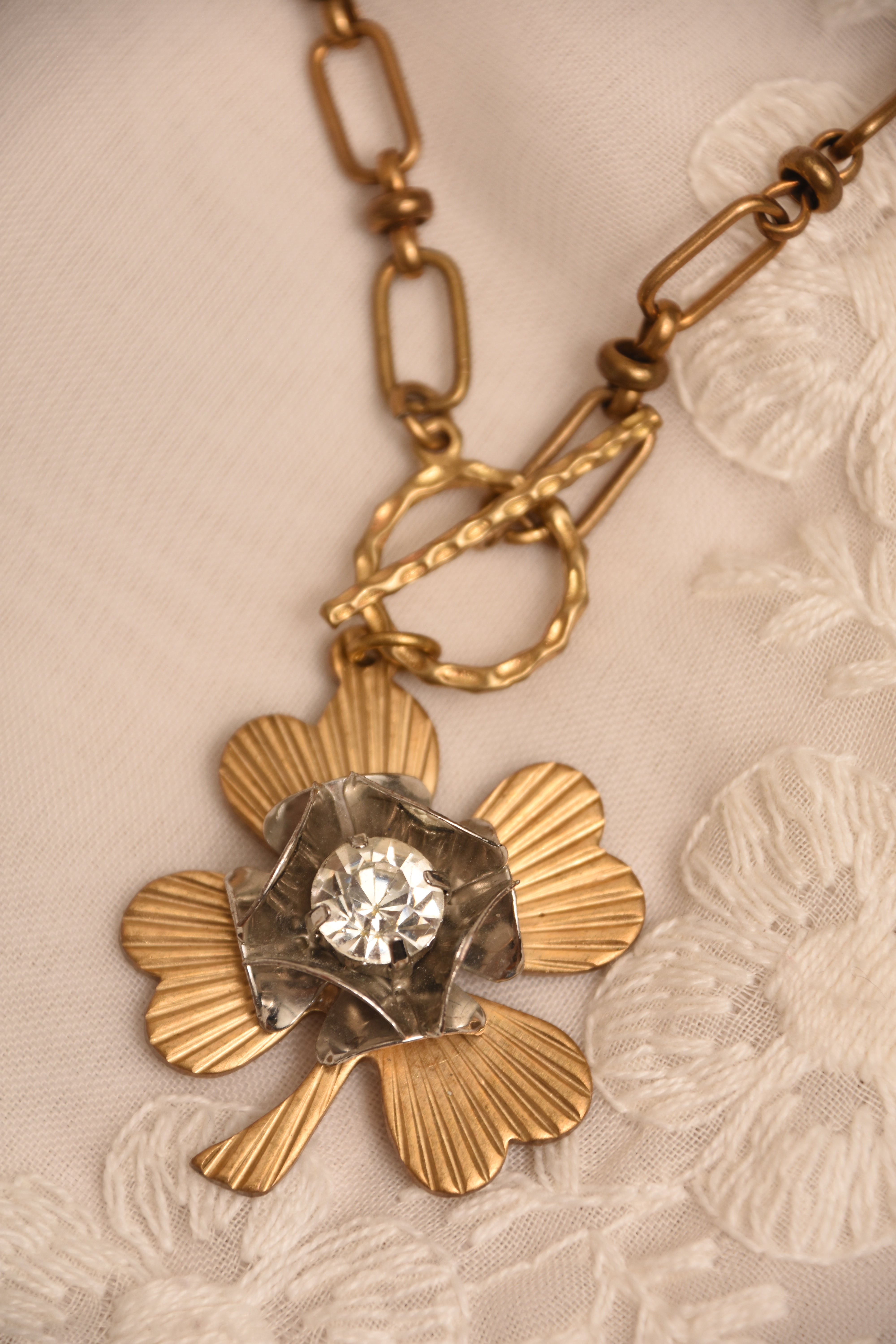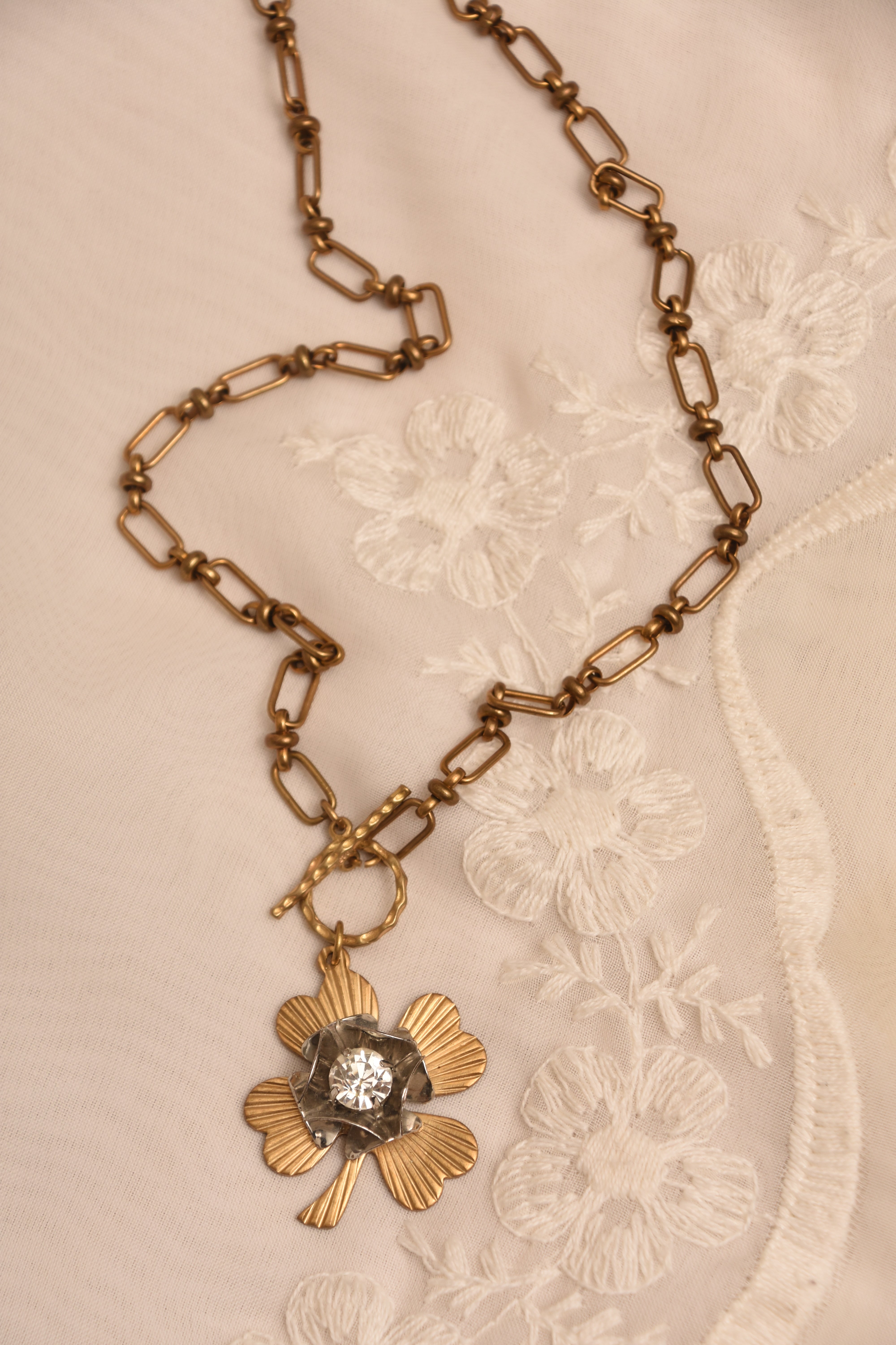 Vintage rhinestone starburst pendant paired perfectly with a brass chain. Lulu's Petals expertly crafts each unique item by transforming classic vintage pieces into unique wearable art.