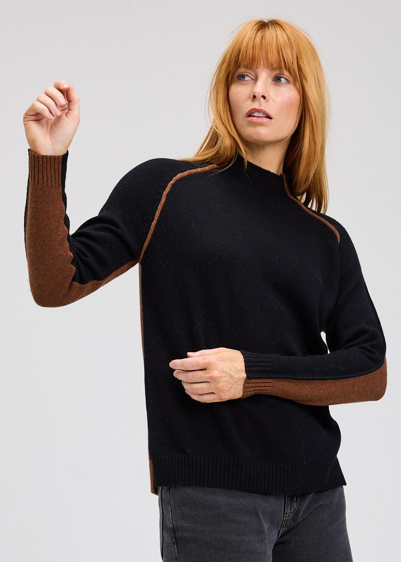 This reversible block funnel sweater features elegant brown accents, making it a sophisticated choice suitable for a variety of occasions.
