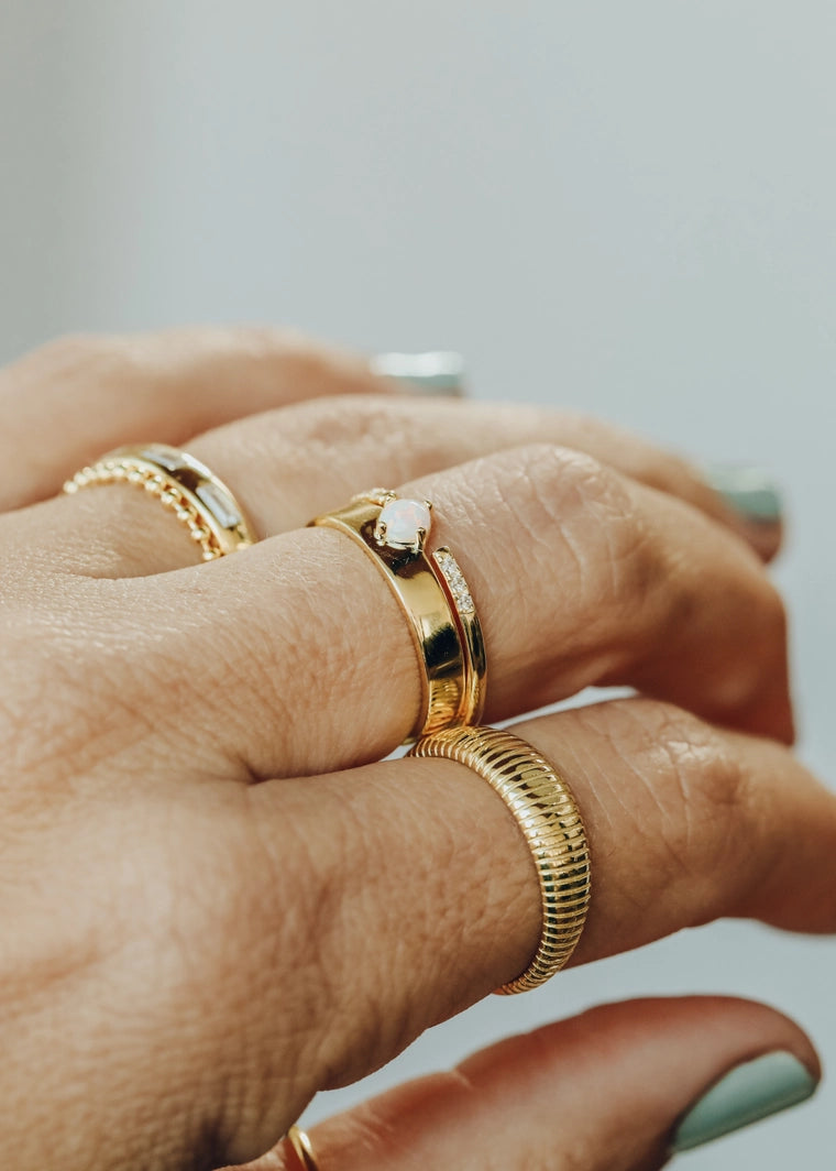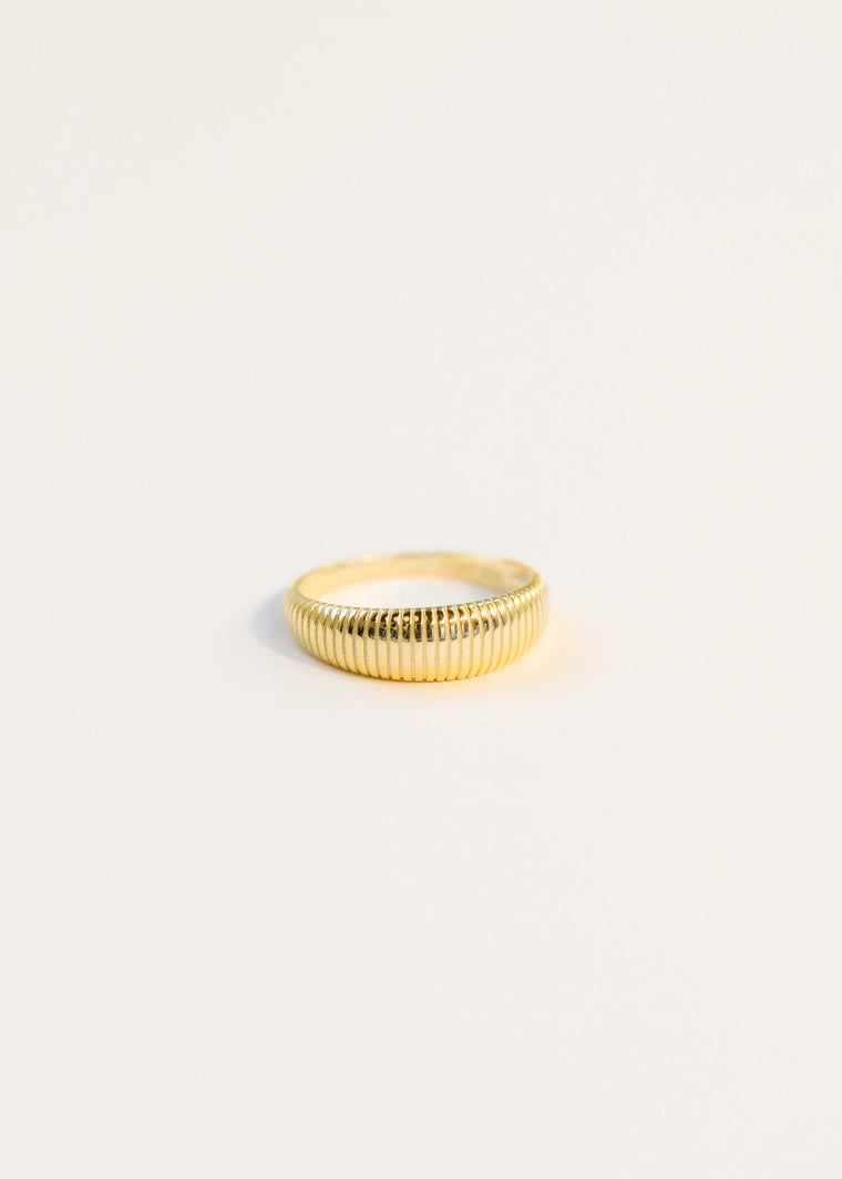 A sleek gold ring with etched ridges. Wear it alone or stack with your favorite bands. Matches perfectly with our ridged cuff.