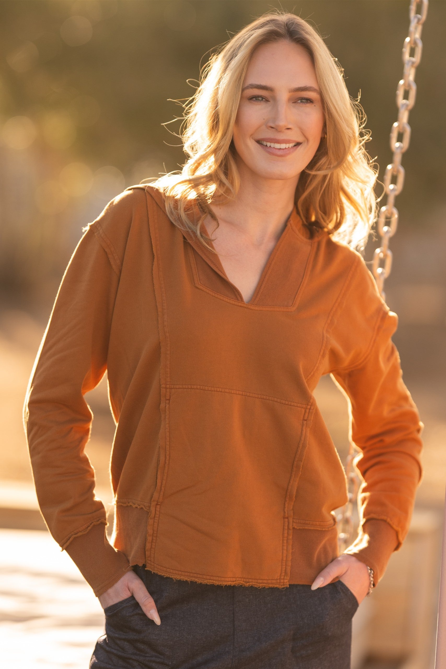 Raw edging details and exaggerated rib contrast has Rosalyn turning heads. With a traditional kangaroo pocket and slimming seaming, Rosalyn will be your favorite fashion sweatshirt.