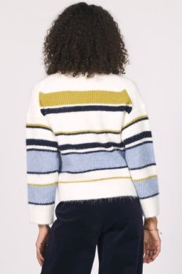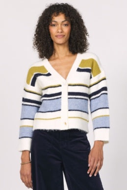 Cozy striped cardigan with a fuzzy touch for extra fun and warmth.