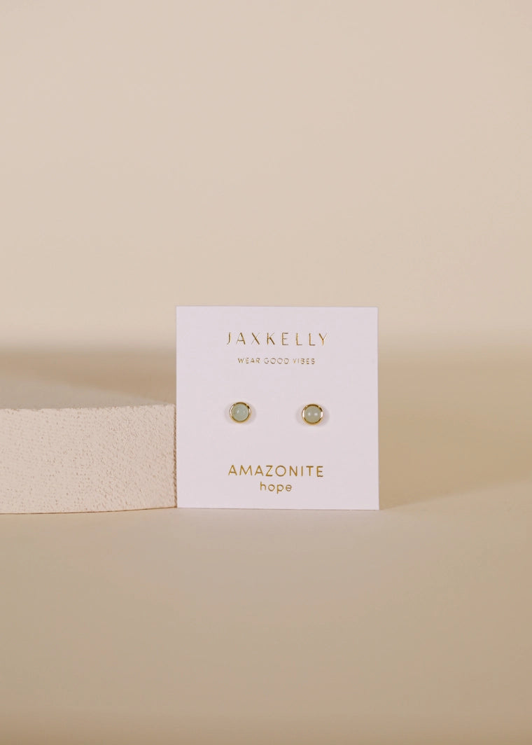 Your new everyday favorite - a classic circular stud with an amazonite stone in the center. Tarnish Free - Long-lasting protective coating safeguards your jewelry from sweat, water, and more.