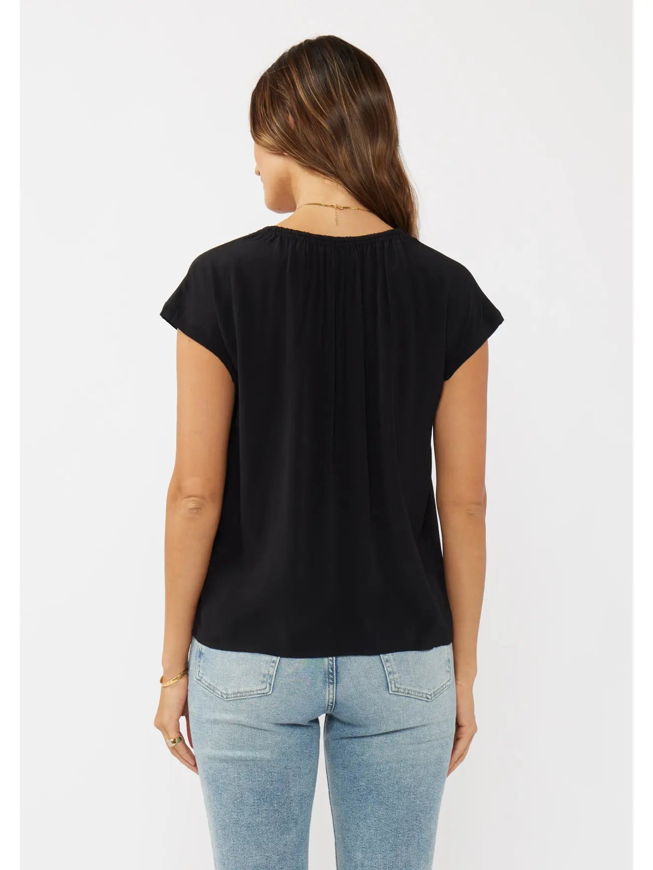 The top showcases a ruched split v-neckline and dolman sleeves, ensuring a comfortable and stylish fit. It's enhanced with double spaghetti ties, adding an elegant touch to the design.