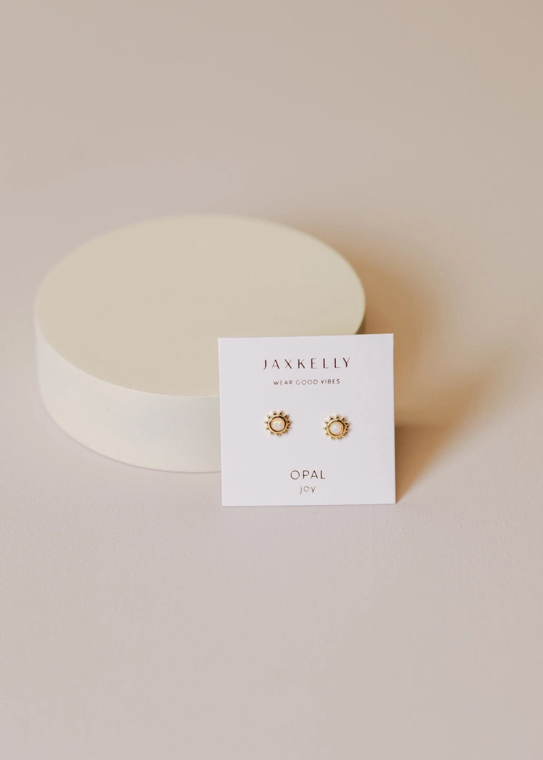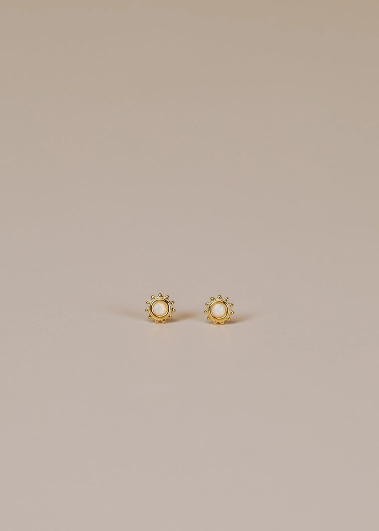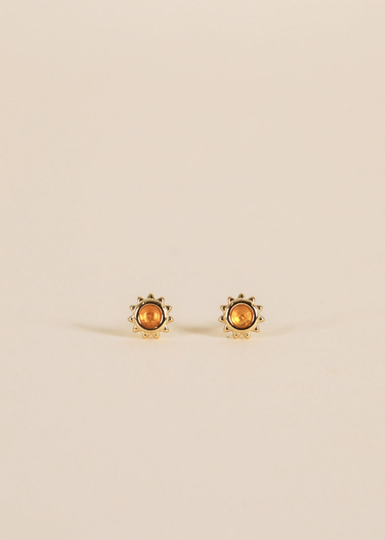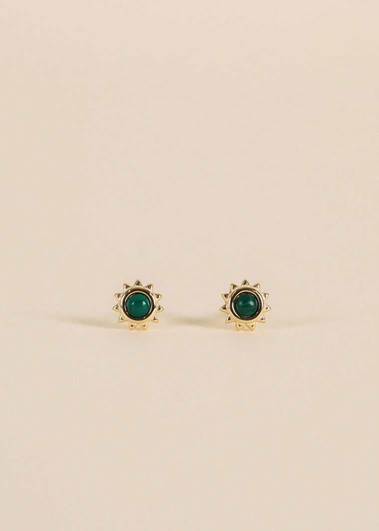 A gold sun featuring a petite polished Amber, Malachite or White Opal stone in the center.