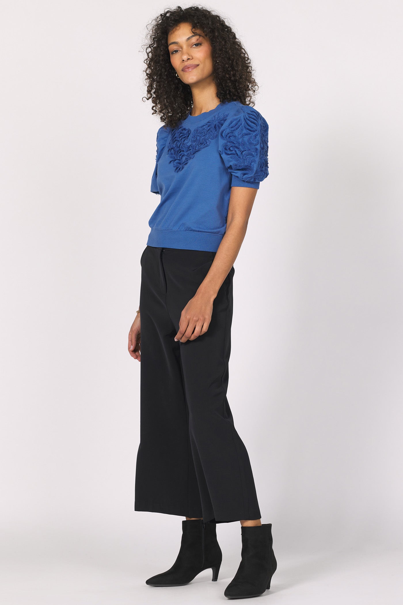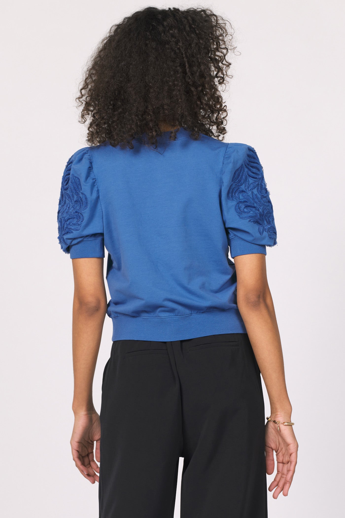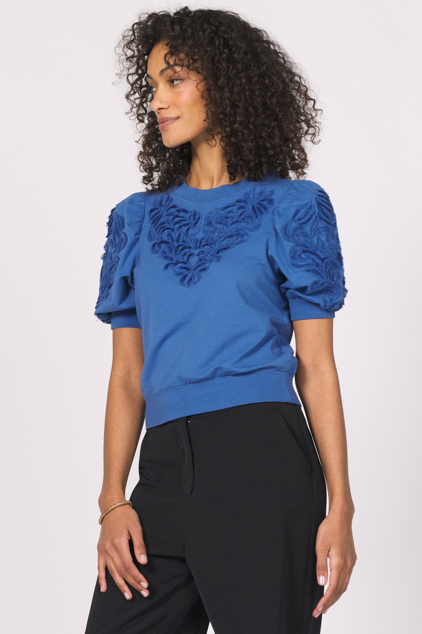 This top is made by Another Love, has elbow length sleeves which are elevated by embroidery that reaches from one shoulder to the other, covering the chest in between.