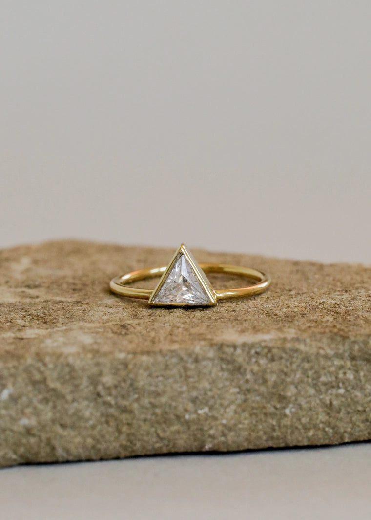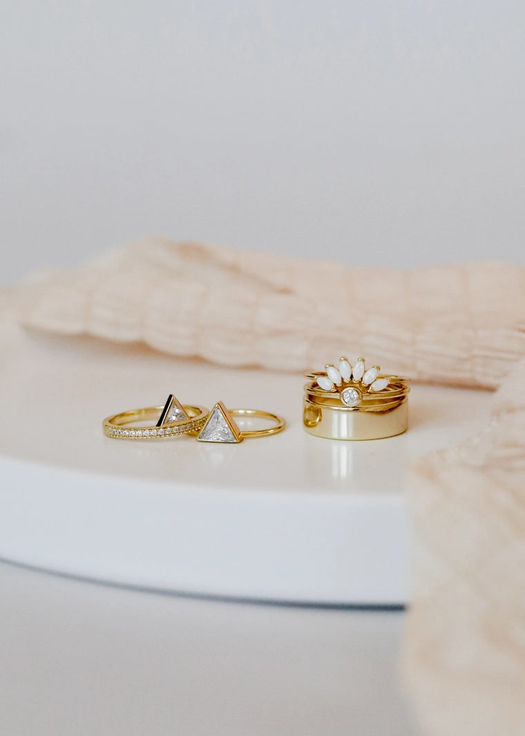 Known as the strongest unit, the triangle represents connection, harmony, creativity, and wisdom. A single CZ is set into a beloved shape, creating a statement piece to stack or wear alone. We crafted our collection of rings to make every day a reminder of joy, self-love, and to shine from within.